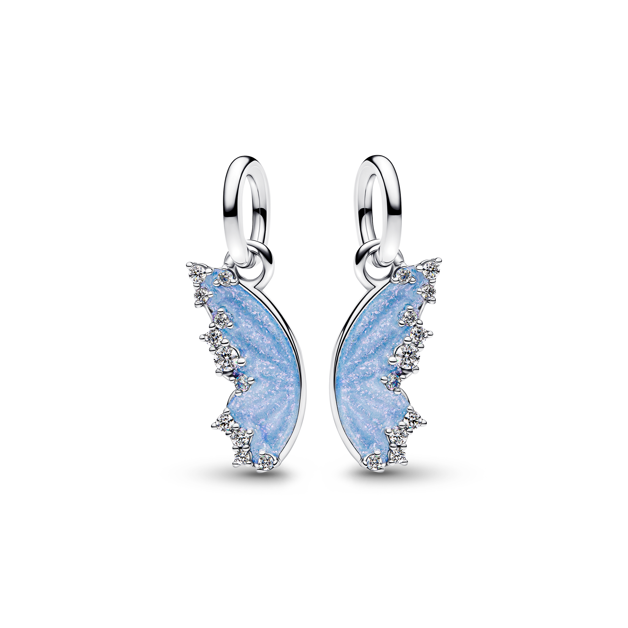 輝く蝶の羽の前面にはきらめくキュービックジルコニアと輝くブルーエナメルが施され、裏面には「TOGETHER ABOVE ALL」と刻印されており、2枚の羽がセットとなったチャームが友人や大切な人とのつながりを表現しています。