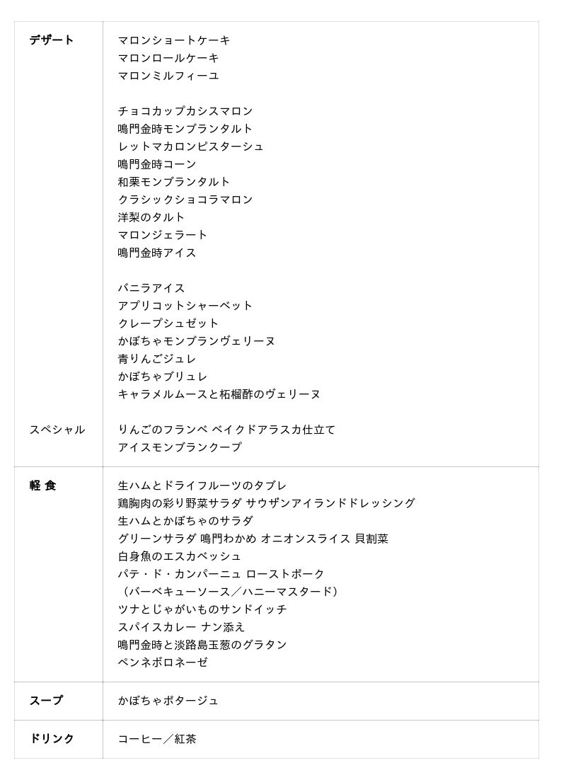 鳴門金時芋タルトやかぼちゃのモンブラン、栗や木の実を使った20種を超える彩り豊かなスイーツがずらり。さらに、シェフ特製オードブルやスープ、生ハムとかぼちゃのサラダ、なると金時と淡路島玉葱のグラタン、ペンネボロネーゼ、サンドイッチ、スパイスカレーなどのお食事メニューもビュッフェスタイルで11種をご提供いたします。目にも美しいアートなスイーツは、どれも小さめサイズで色々な種類を少しずつ味わえるのも魅力。