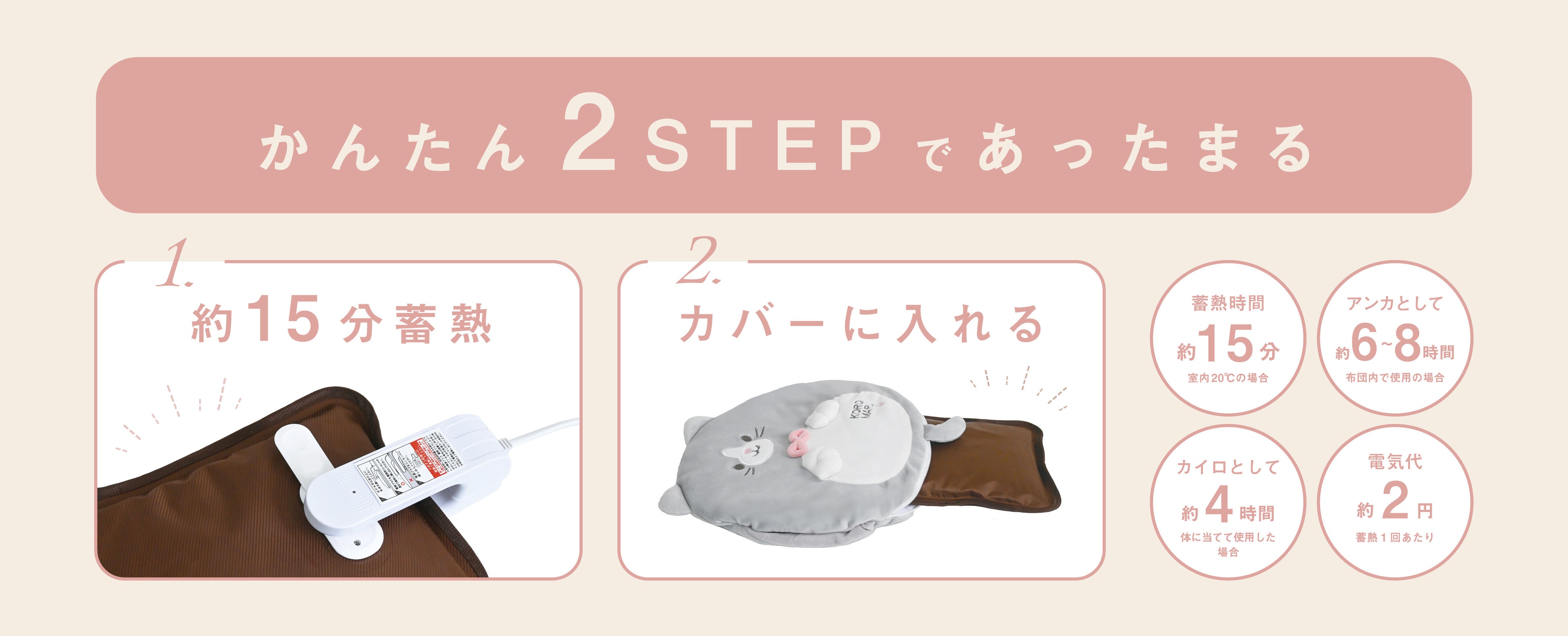 昨年までの商品と同様に1回の蓄熱時間が約15分で、最長約8時間温かさが持続する蓄熱式の湯たんぽです。また、蓄熱1回あたり約2円で節電対策にもなり、家計への負担を減らしながら防寒対策ができます。(※用途によって持続時間は変動します)