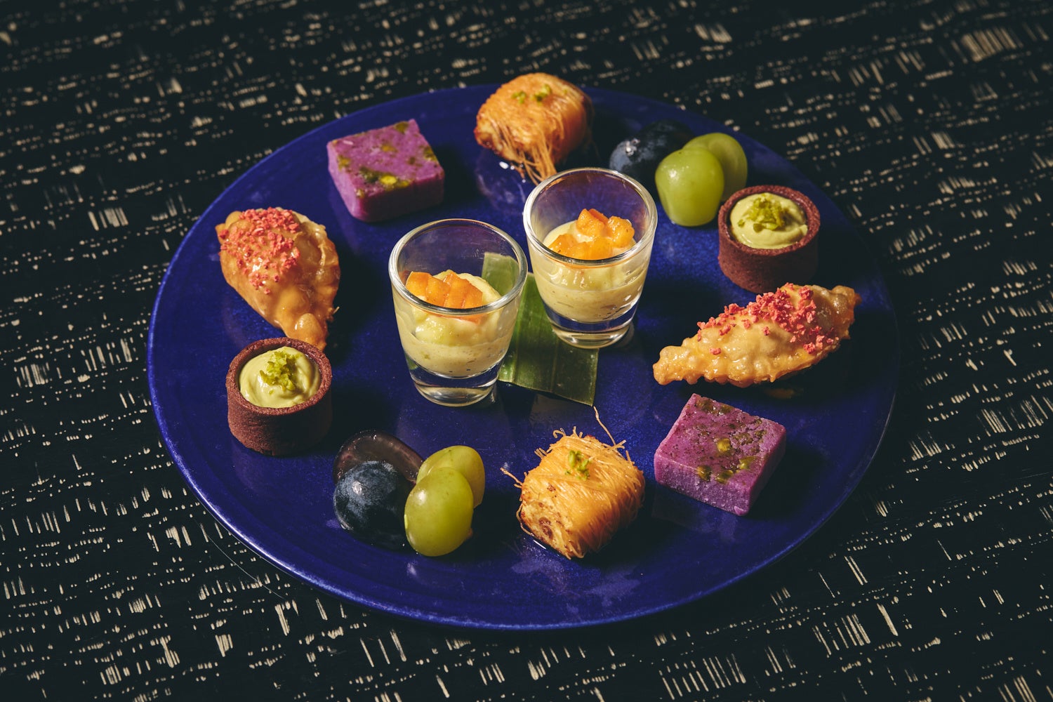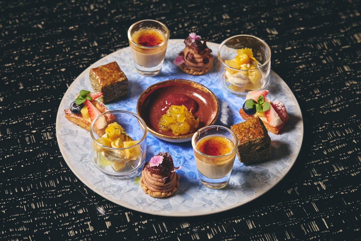 メニューは、"モダンインディアンキュイジーヌ"を提供する「SPICE LAB TOKYO」と「THE GREY ROOM」両店のエグゼクティブシェフを務めるテジャス・ソヴァニが考案。インドのルーツを持つバーならではの視点で、イギリス発祥のアフタヌーンティーを再構築。2つのテーマのスイーツをお楽しみいただけます。