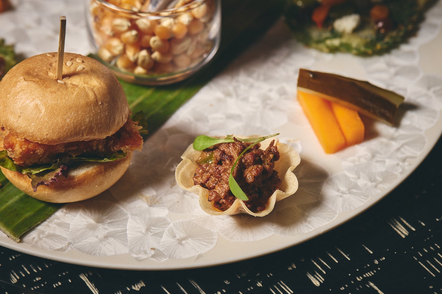 また、下段にはサクサク食感がクセになる「大葉のチャート」や「フィッシュアムリトサリスライダー」などインドの軽食やストリートフードを再構築したセイボリーも充実。最初にスパイシーなセイボリーを食べることで食欲を促進し、ティータイムの会話も進みます。