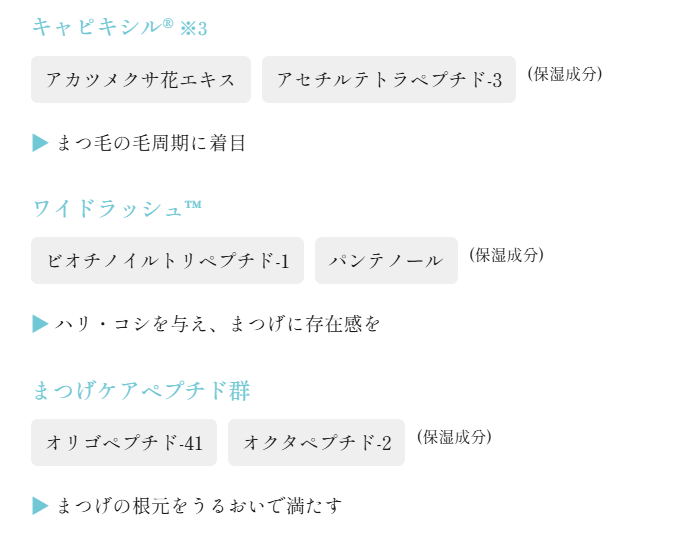 *2 アカツメクサ花エキス、アセチルテトラペプチド-3、ビオチノイルトリペプチド-1、パンテノール、オクタペプチド-2、オリゴペプチド-41