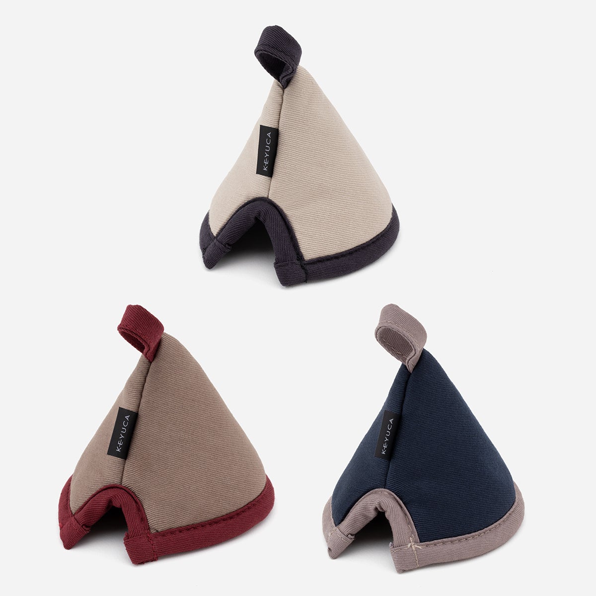 指先でつまむように使える三角帽子型で、細かい動作にも対応。耐熱ゴムの裏地で滑りにくく、ループ付きで収納性も抜群です。