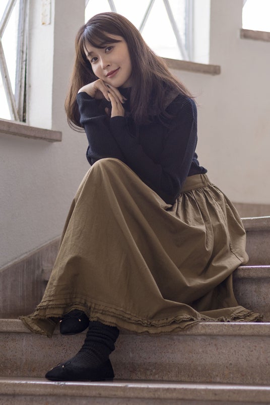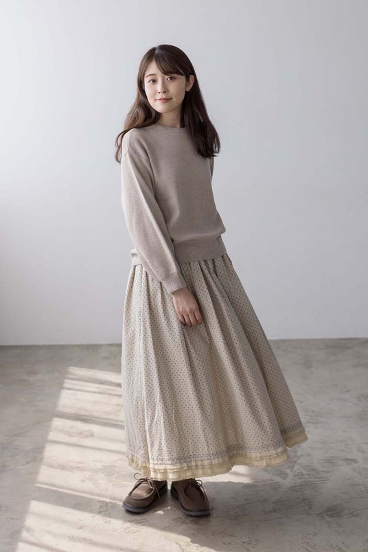 フリル具合を引き算しながら、甘すぎないバランスを追求しました。シアープリーツはSamansa Mos2のお洋服に相性が良く、今回新しく取り入れてみました。ギャザーがたっぷりと入っていますが、すっきりとした落ち感の品のいいAラインシルエットがお気に入りです。