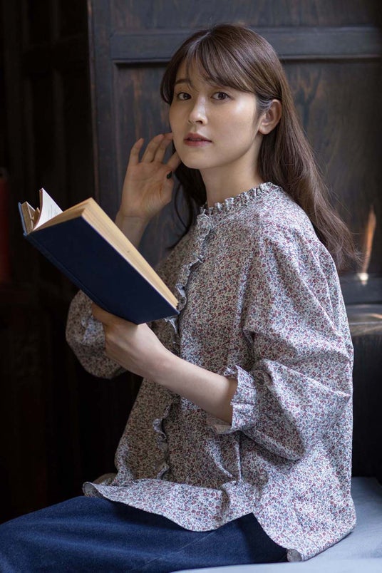 ブラウスは大人っぽさもありつつ、レトロな雰囲気を目指しました。花柄は本当に面白く、1つ1つの花の彩度が違うだけで見え方が変わってくるので、仕上げるまでどきどきでした。タックアウトしてもバランスが良く見えるよう、裾は前後差をつけてラウンドさせています。合わせるアイテムによって、甘めにもかっこよくも着られると思います。