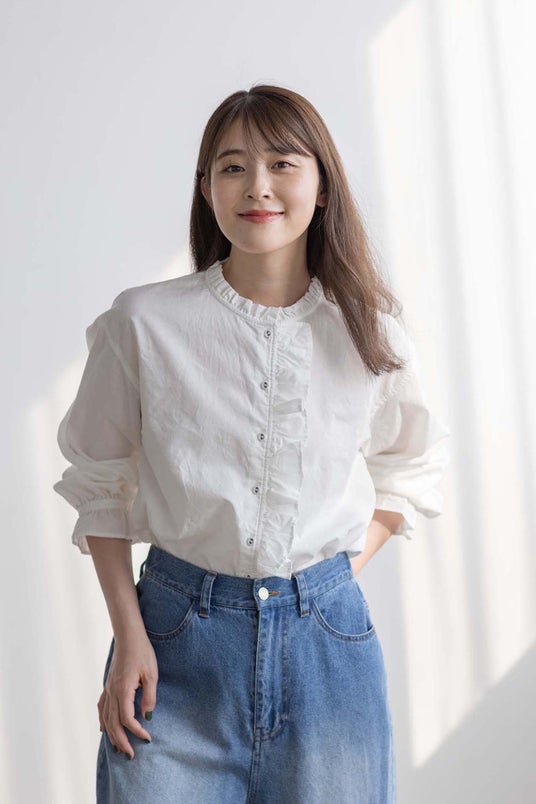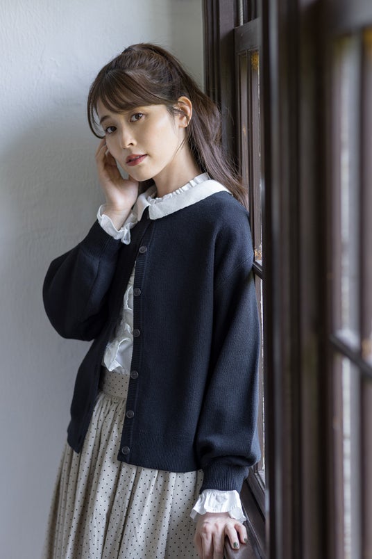 前後2WAYで着られるカーディガンは、襟の配色にも注目です。襟や袖からフリルブラウスを見せると抜け感が出て、ふわっと膨らんだ袖も可愛さの秘訣。すっきり見える丈感なので、ボトムスとのバランスもとりやすいです。
