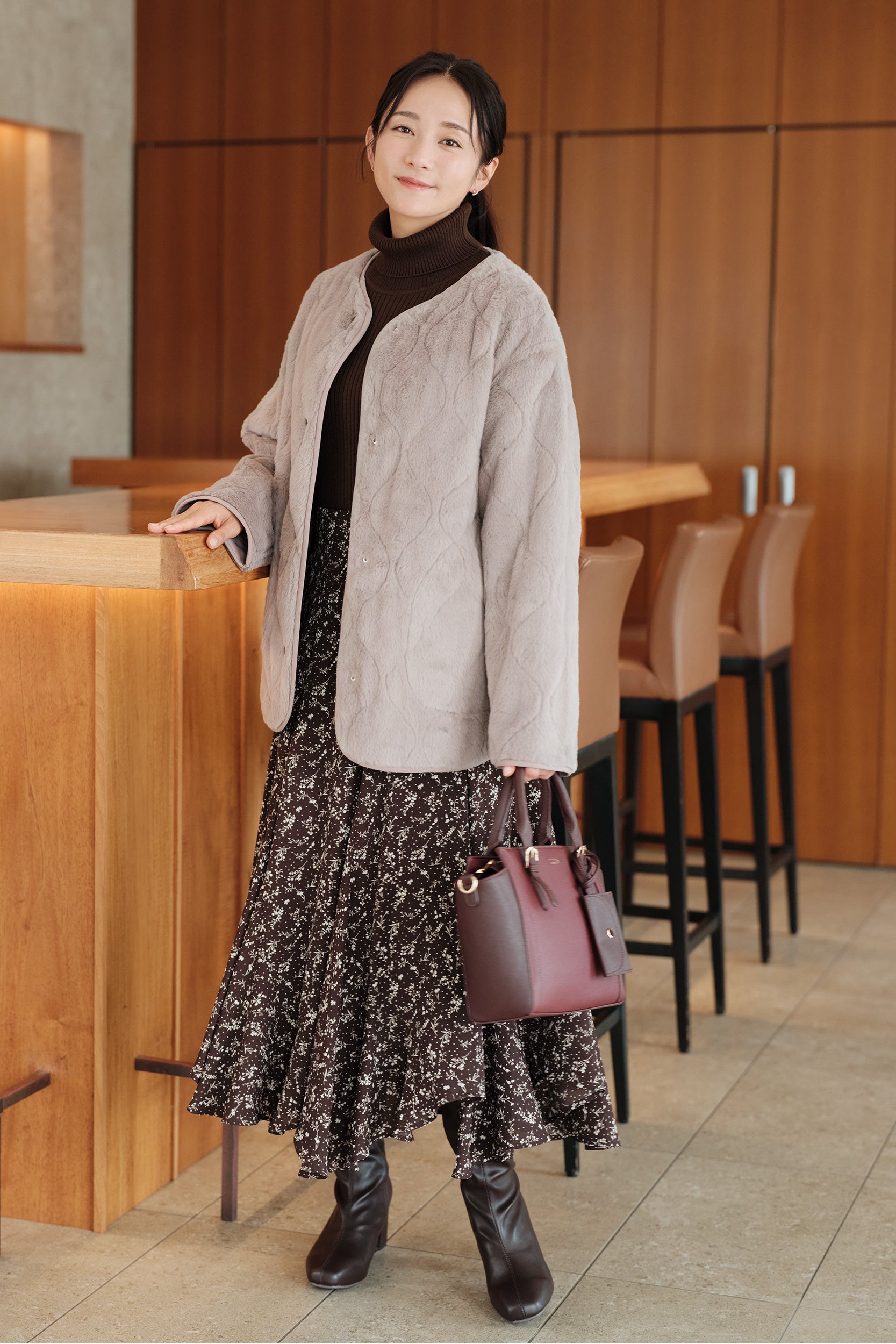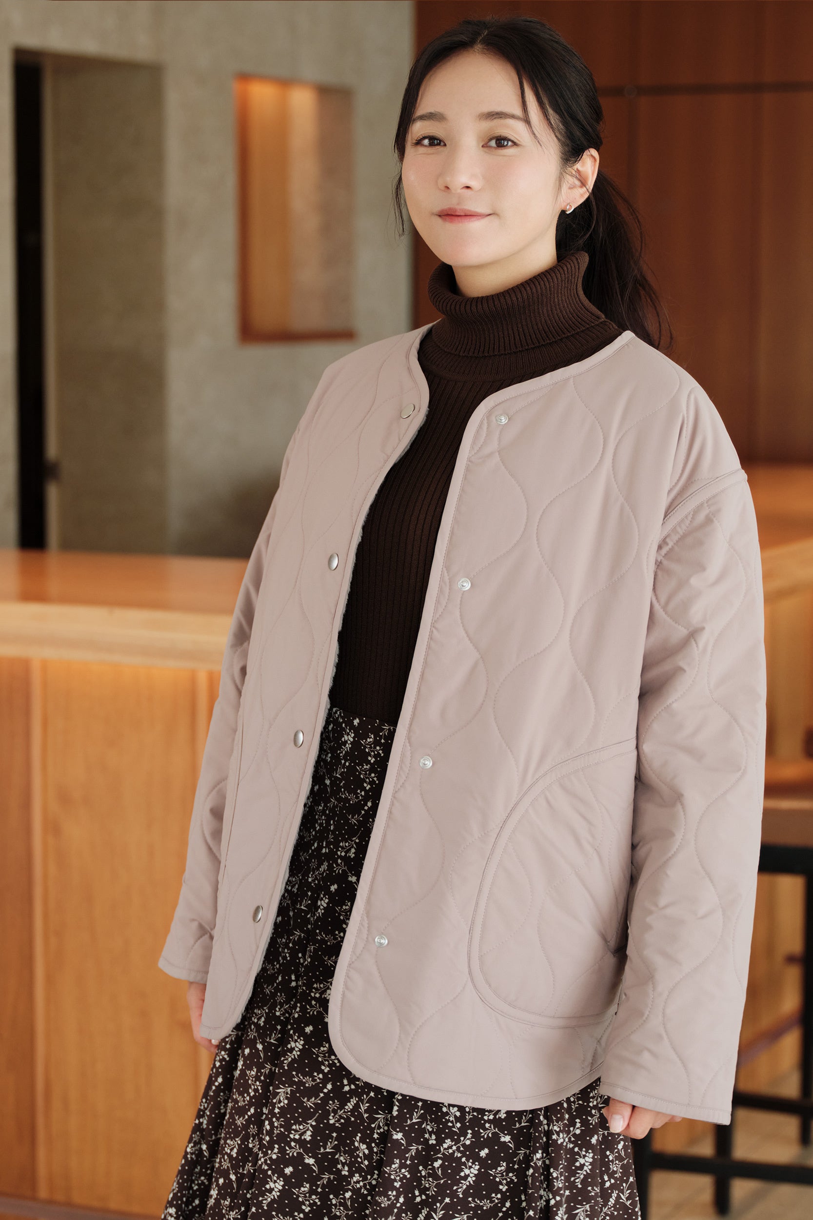 木村文乃さんとのコラボカラー"モカ"を採用した、キルティングのブルゾン。上品で合わせやすいモカカラーに、フェイクファー面とプレーン面のリバーシブル仕様を組み合わせたこのアイテムは、シーンや着こなしに合わせて自在に着回せます。休日はフェイクファー面で軽やかに、普段使いやお出かけはプレーン面で落ち着いた印象に。一枚で印象を切り替えられる冬の主役アウターです。