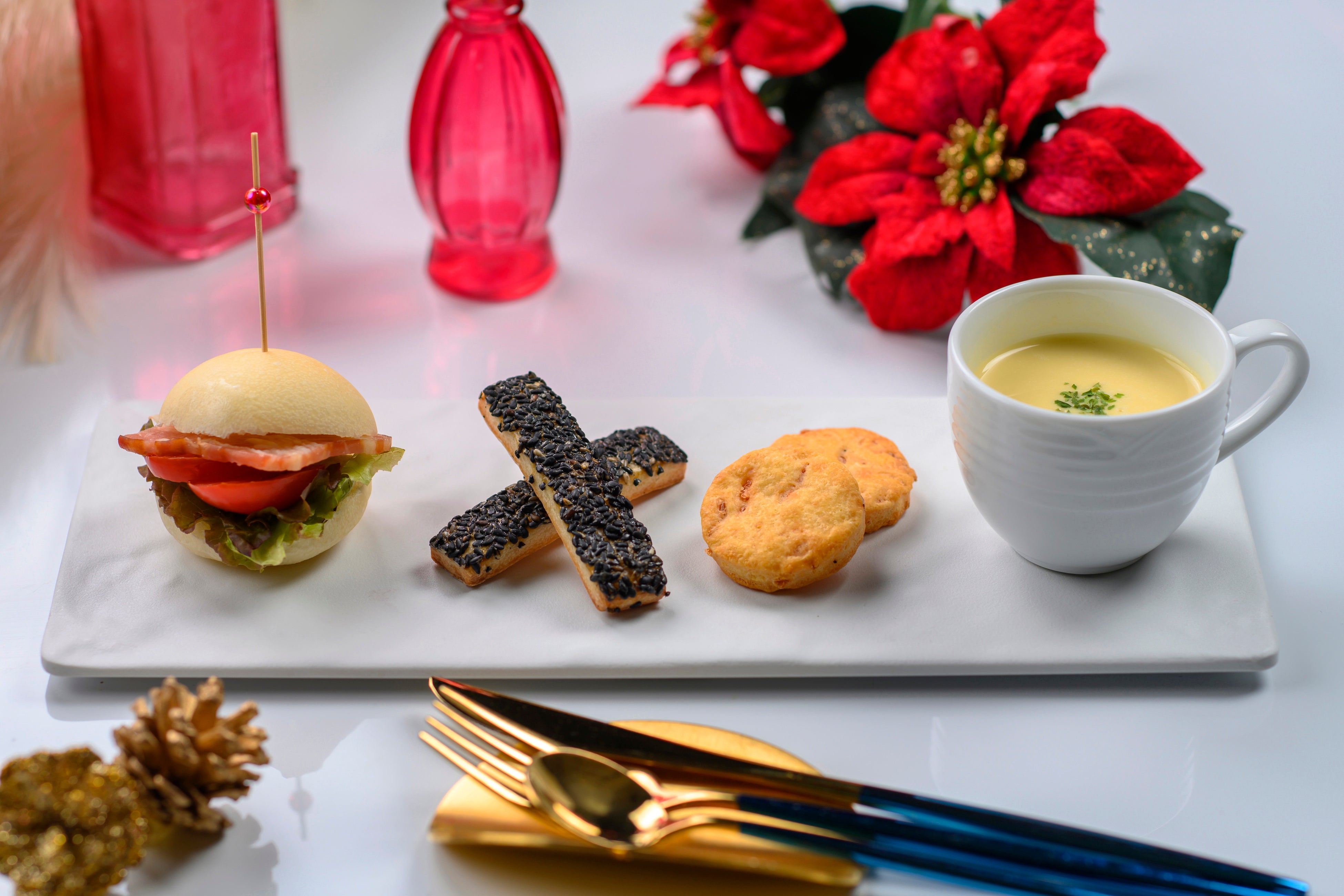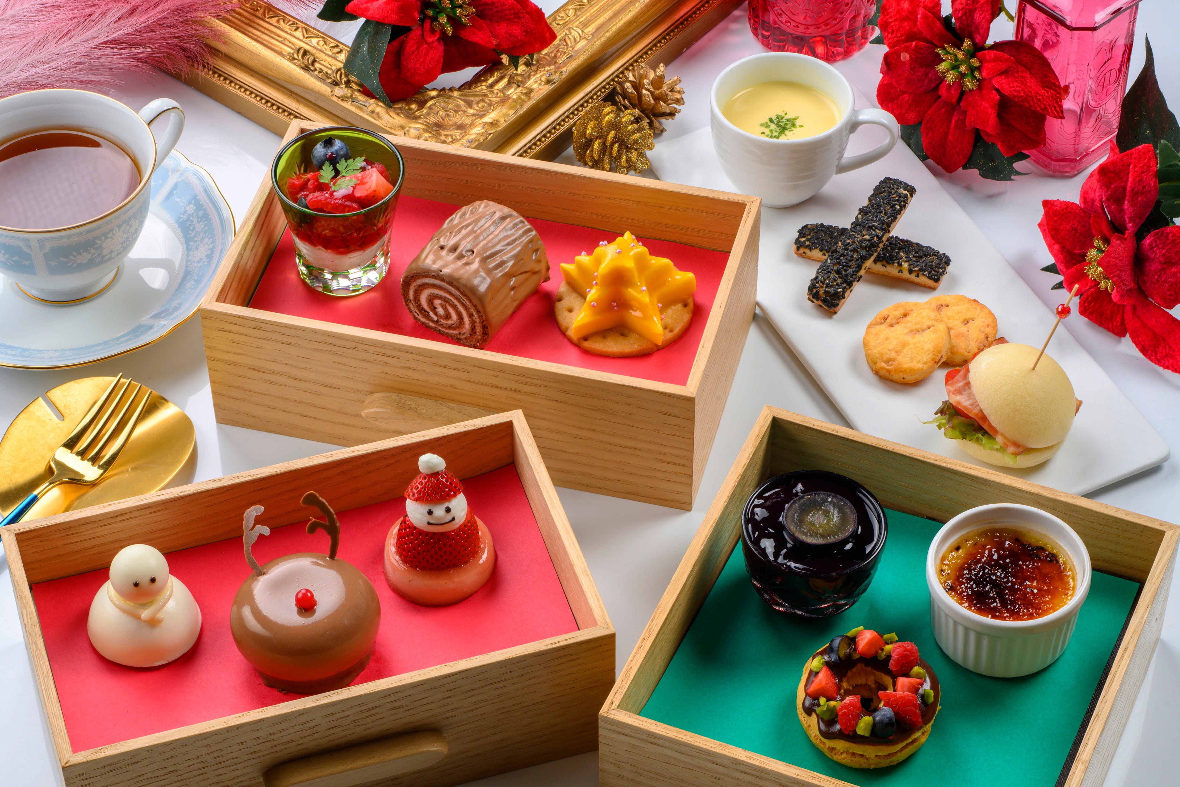 クリスマスを象徴するモチーフが並び、テーブルを華やかに彩ります。セイボリーは、ベーコンとトマトをサンドしたロールパンや海老の風味を楽しめるサブレなど、甘みとのバランスを考えたメニューをご用意しました。パティシエのこだわりが詰まった一品一品を、クリスマスならではのデコレーションとともにお楽しみいただけます。
