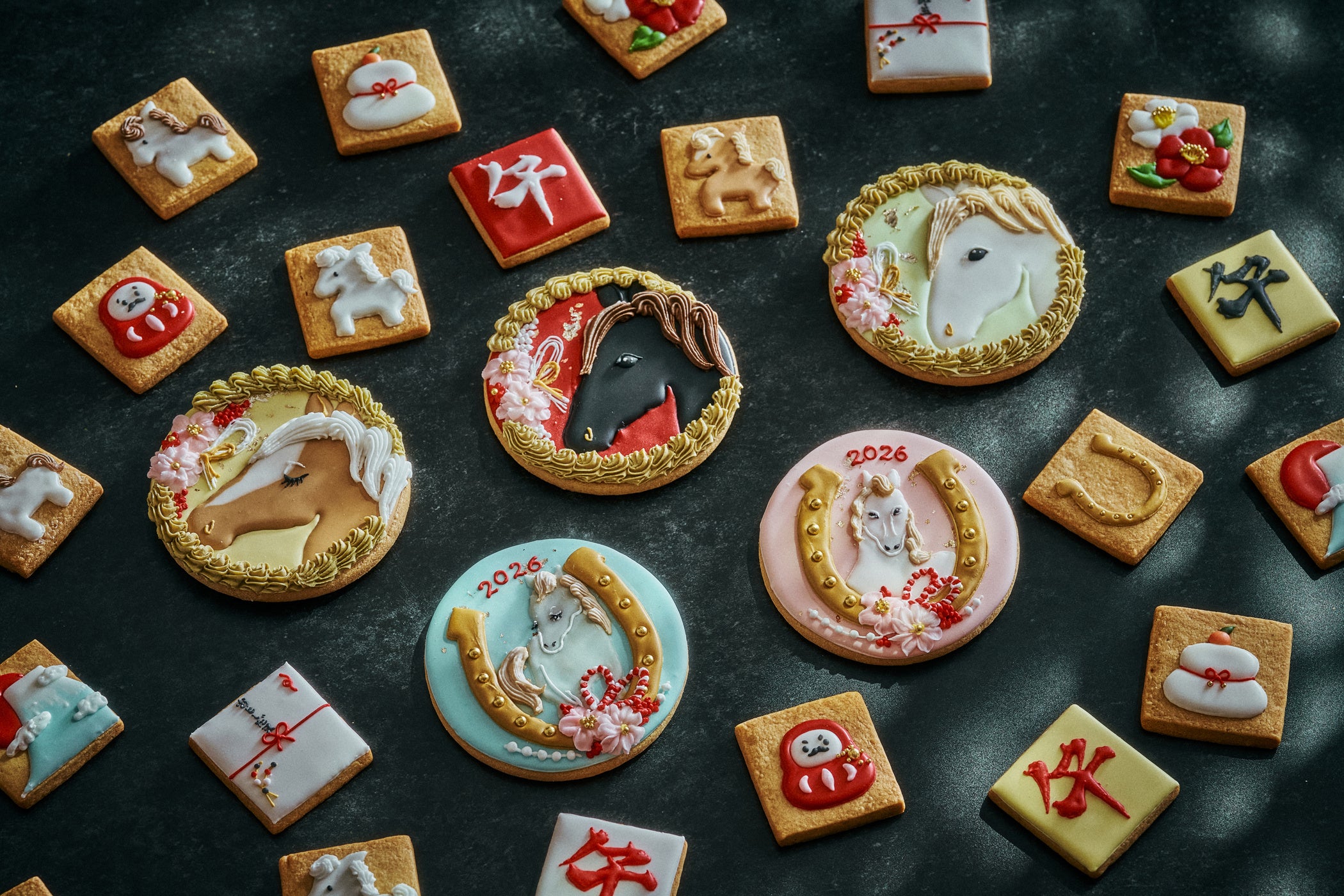 2026年の干支、そして成功や勝利のシンボルとも言われる「午(うま)」を一枚一枚丁寧に描く、新年の幸運を祈願したアイシングクッキーです。焼き上げからデコレーションまでパティシエが手作業で仕上げるアイシングクッキーは、お年賀や手土産、お子さまへのギフトとして毎年ご好評をいただいています。一つひとつ異なる馬の表情やお正月のデザインにもぜひご注目ください。