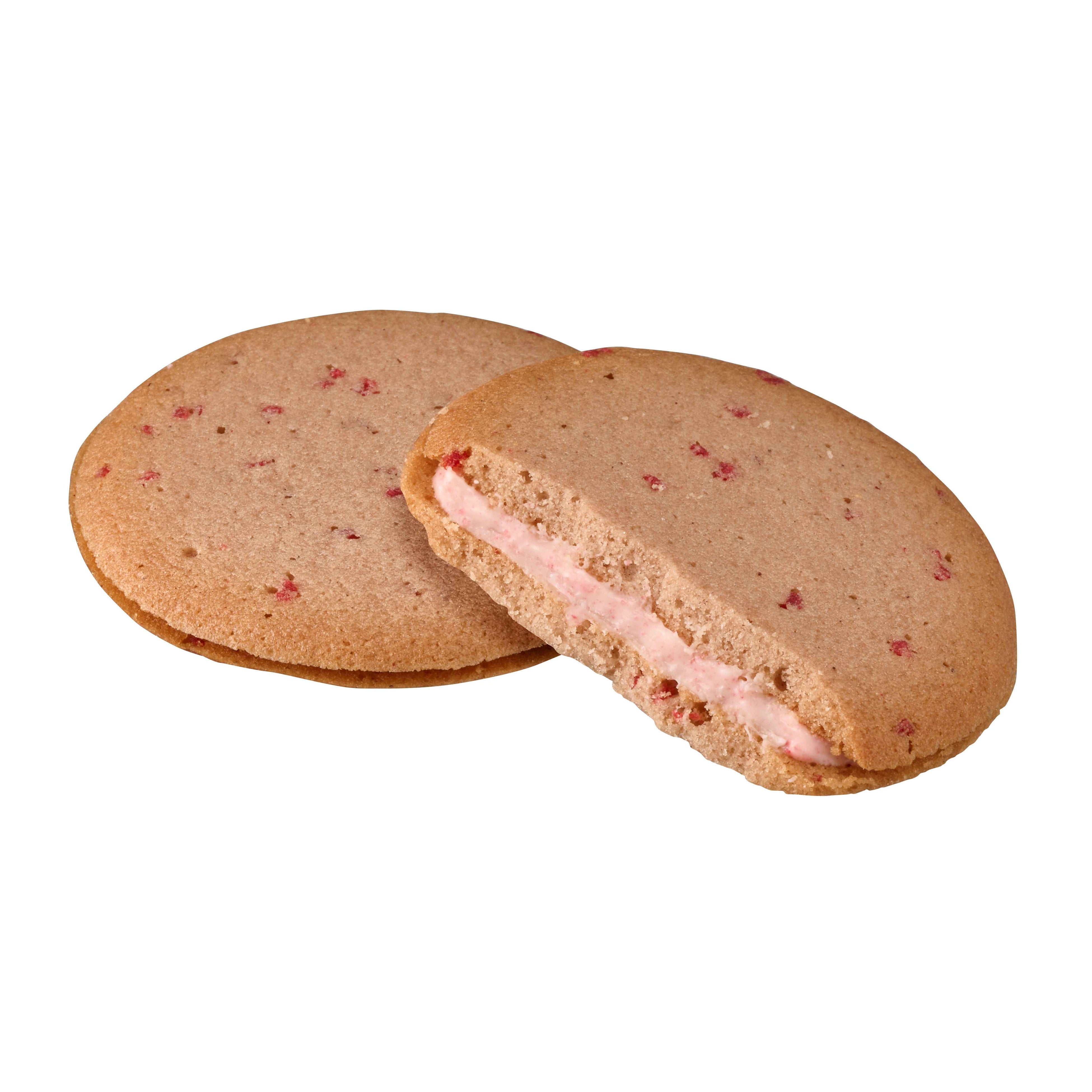 あまおう苺パウダーを練りこんだ甘酸っぱいホワイトチョコレートを、ホワイトチョコレートパウダーを混ぜこんだラングドシャ生地でサンドしたクッキーです。ラングドシャ生地に入ったストロベリーチップが食感のアクセントになっています。