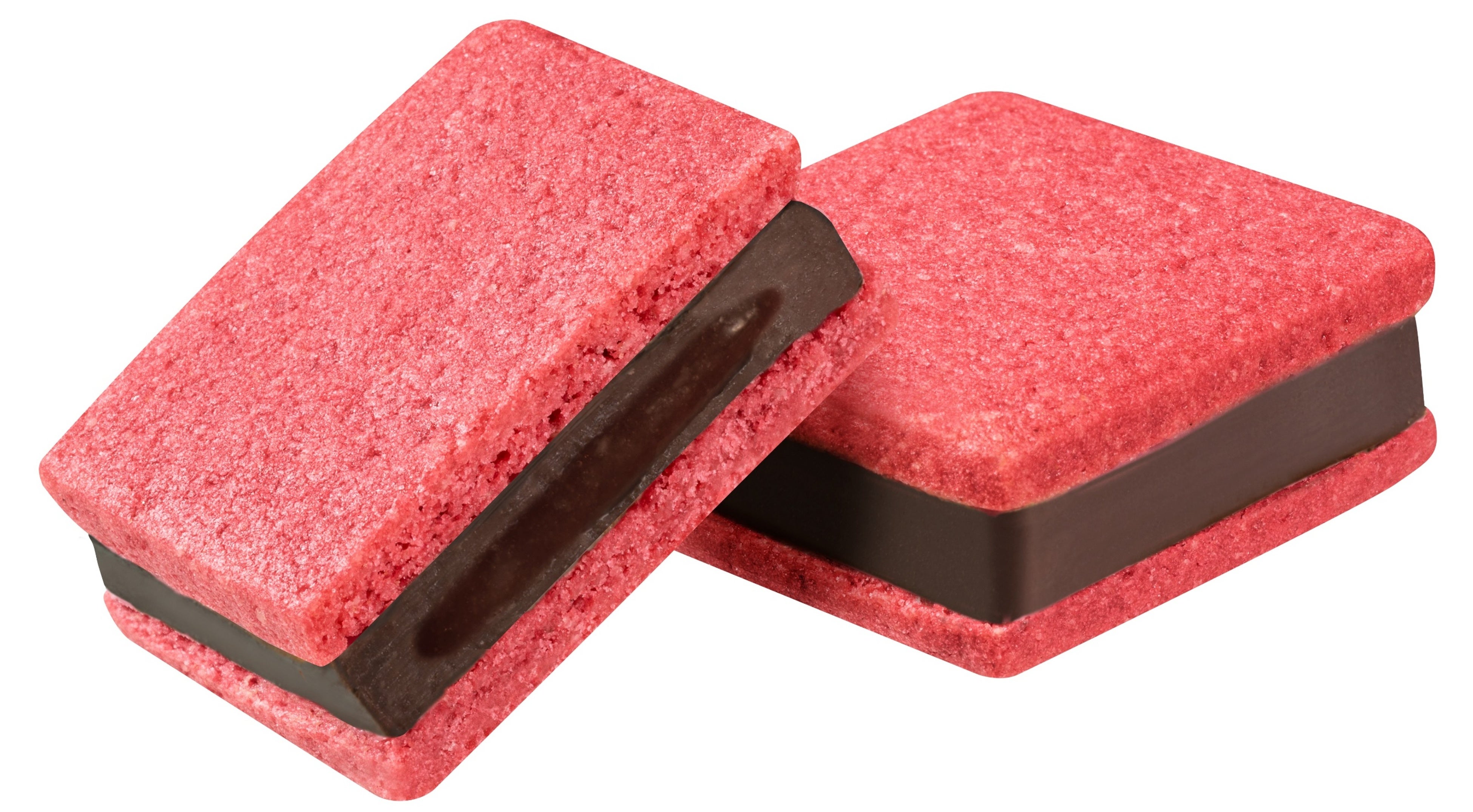 心地よいビターな味わいのセミスイートチョコレートガナッシュで甘酸っぱいストロベリーソースを包み、苺パウダー入りのサクッとしたサブレでサンドしました。芳醇なセミスイートチョコレートを苺の酸味が引き立てます。