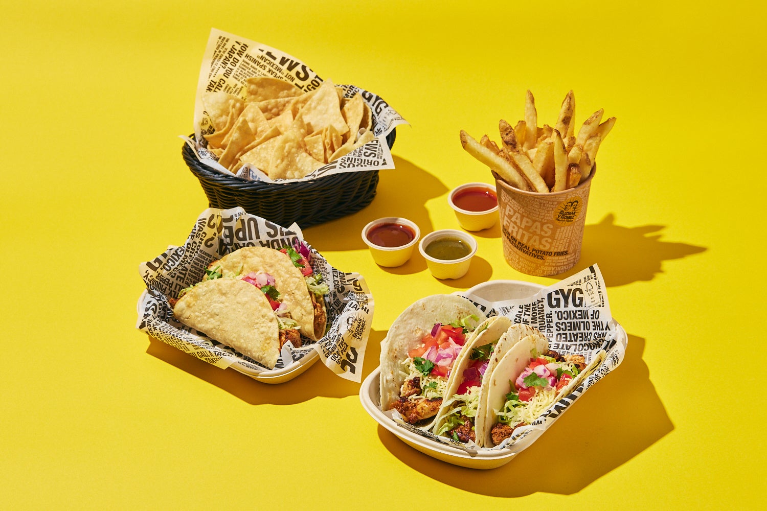 内容品:タコス5ピース、ポテトL、チップスL、ノーステッドハラペーニョソース、スモーキーチポトレソース、ハバネロソース