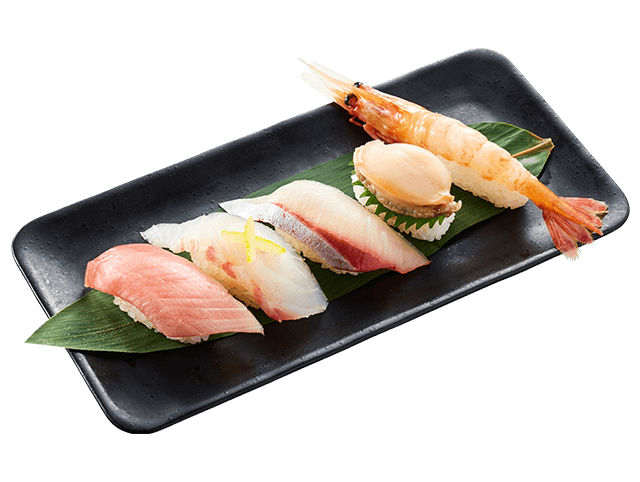 『かっぱの極み贅沢にぎり~秋の五貫~』【200円(税込)お得】1,340円(税込)~⇒1,140円(税込)~みなみ鮪中とろ、大切り活〆真鯛柚子塩、活〆はまちはらみ、大切り蝦夷あわび、ぼたん海老(店内殻剥き)※店内飲食限定