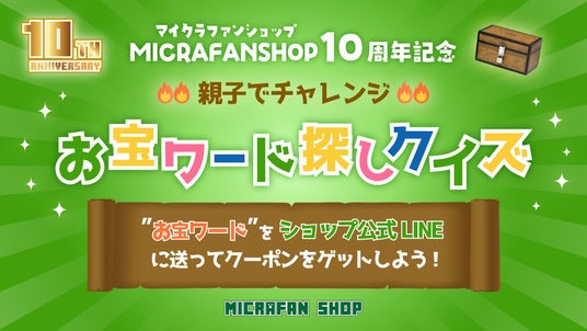 マインクラフトに出てくるモブやアイテムに関するクイズに挑戦し、答えとなる「秘密のワード」をショップ公式LINEアカウントに送信してください。 正解者全員に次回のお買い物で使える10%OFFクーポンをプレゼントいたします。