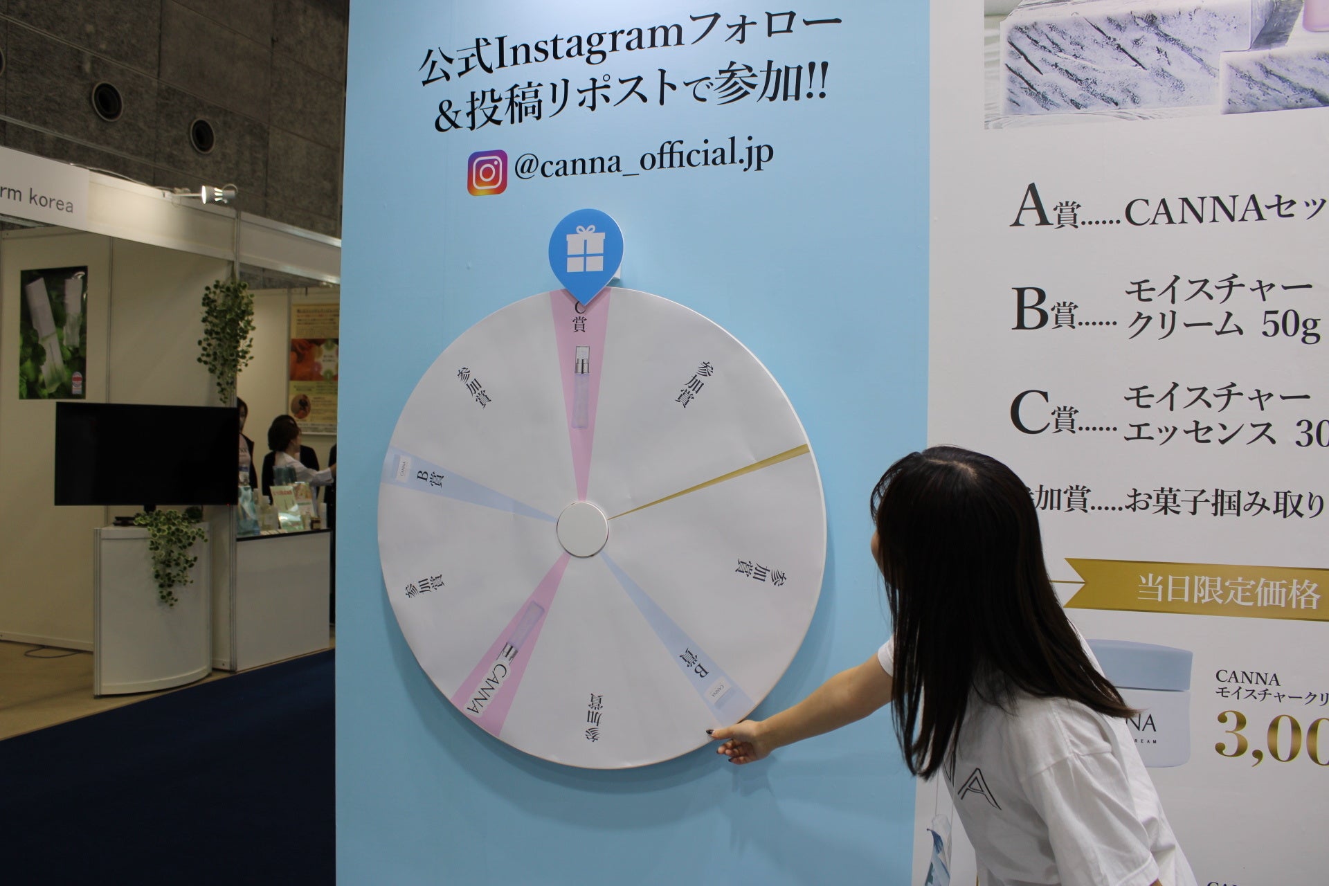 今回の展示では、CBD配合スキンケアを実際に体験できるブースを設け、オンライン限定商品を来場者にご紹介。製品の使用感をその場で確かめていただける体験会やサンプル配布、またフォロー&リポストで景品が当たるルーレットイベントなどを実施しました。