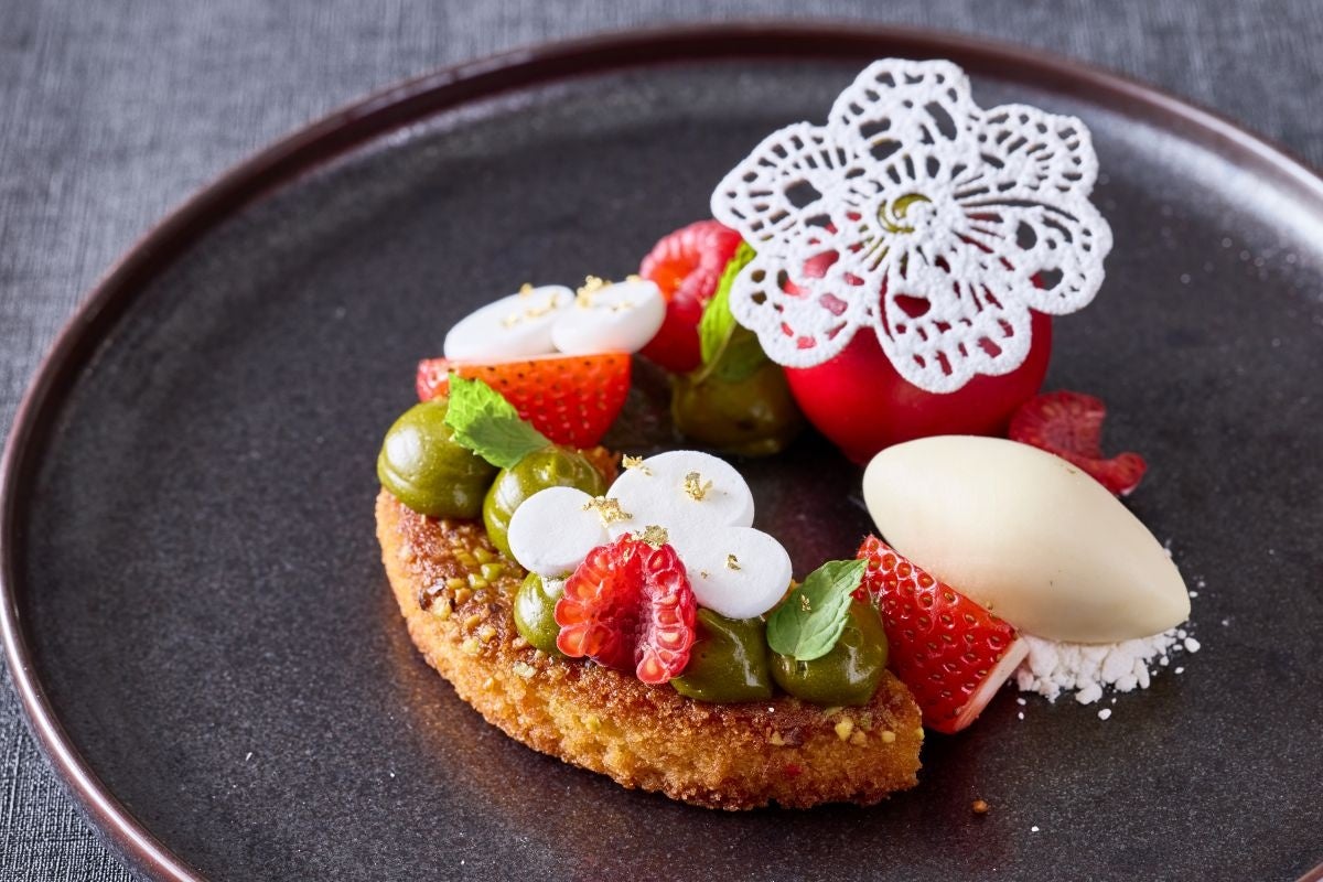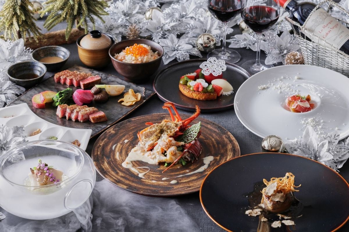 2025年12月20日(土)~25日(木)に、ランチ(3コース)・ディナー(4コース ※22日(月)・23日(火)以外は3コース)ともにクリスマス限定の特別コースを販売いたします。炎が高く上がる大迫力のフルーツトマトのフランベから始まり、オシェトラキャビアを添えた寒ブリとのどぐろの炙りの冷前菜は、ドライアイスの演出で思わず写真を撮りたくなる一品です。 温前菜のフォアグラやトリュフをふんだんに使用した、フォアグラカナールと京野菜の聖護大根のポワレは、スタッフが目の前でトリュフを削るため、香りやパフォーマンスをお楽しみいただけます。活伊勢海老のグリルは、濃厚な雲丹のソースを贅沢に使用しており、伊勢海老との相性抜群で特別感あふれる一品です。コースの最後を飾るデザートでは、クリスマスリースをモチーフに苺やピスタチオを使用し、パティシエのこだわりが詰まった色鮮やかな可愛らしい一皿とお飲み物を提供いたします。