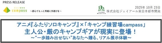 ◎キャンプ初心者のための体験型施設「キャンプ練習場campass(キャンパス)」は、人気アニメ『ふたりソロキャンプ』とのコラボレーション企画として、主人公・樹乃倉 厳(きのくら げん)が劇中で 使用するキャンプギアを再現・展示する期間限定イベントを開催いたします。