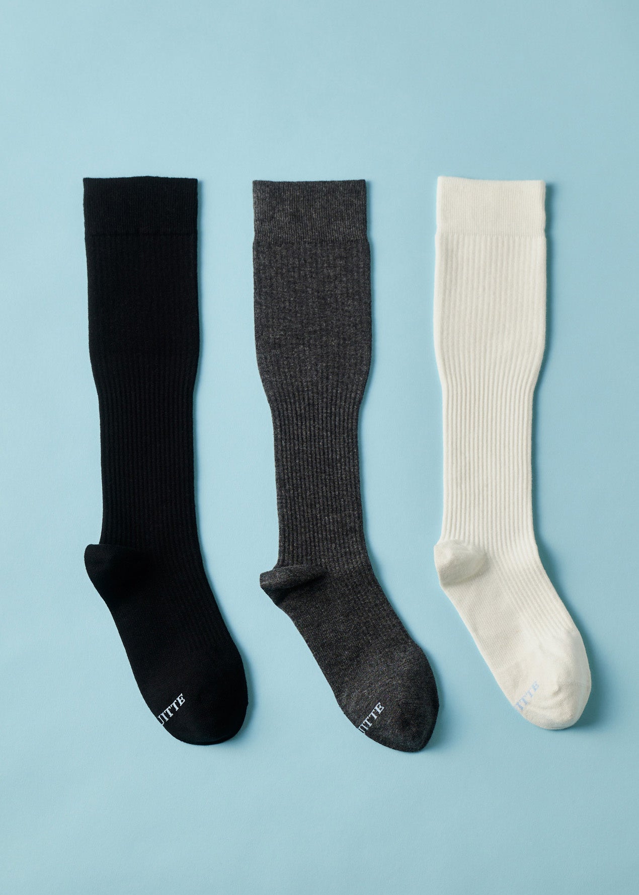 洋服と合わせて洗練されたムードを作るアンニュイカラーに拘り、足の浮腫みを軽減しながらお洒落も楽しめるデザイン。履き口は柔らかいリブ編みにすることで着脱しやすい仕様にしています。