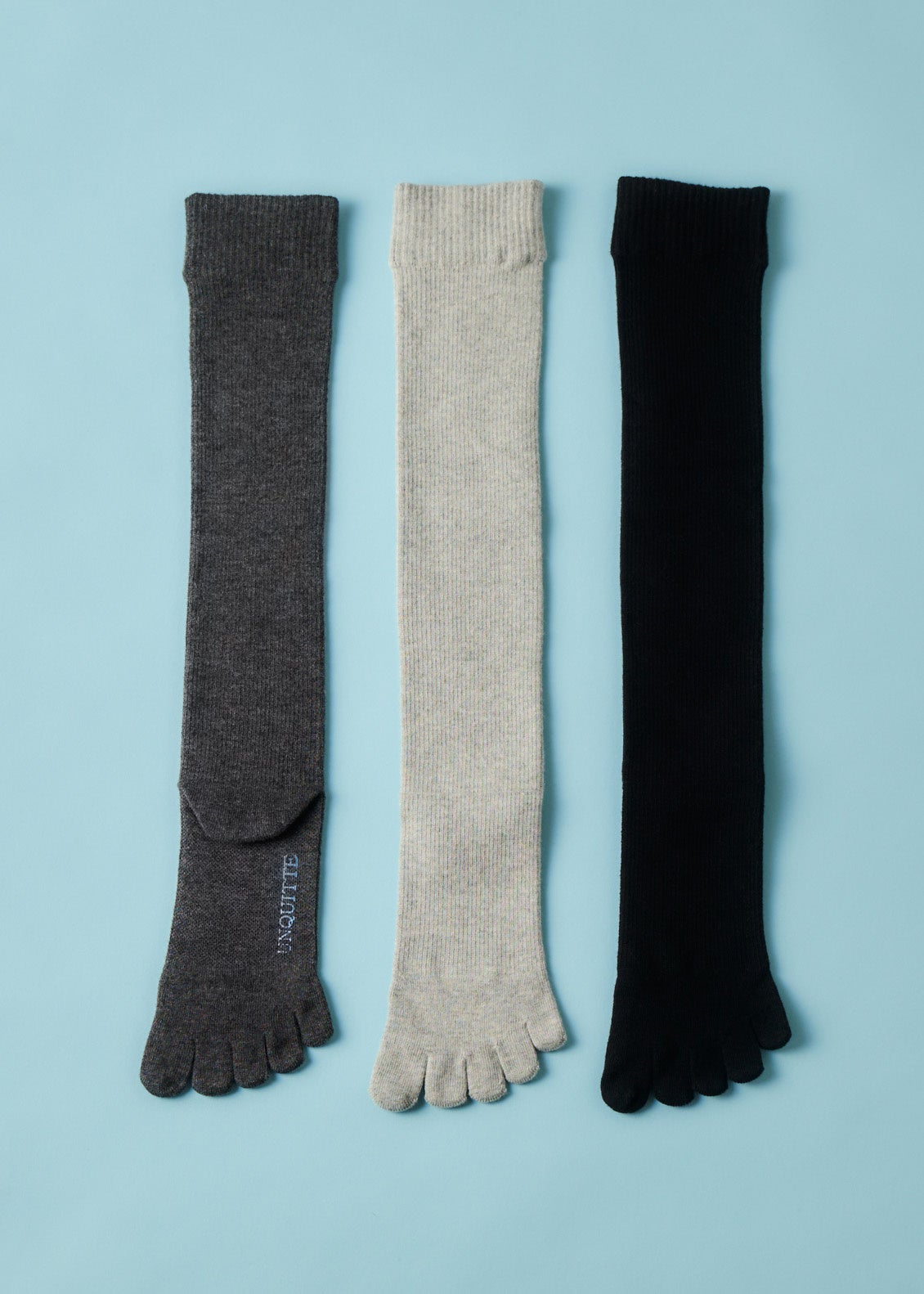 ふくらはぎは浮腫みを軽減し足をすっきりと見せてくれる段階着圧、足先は5本指仕様の爽健美ソックス。