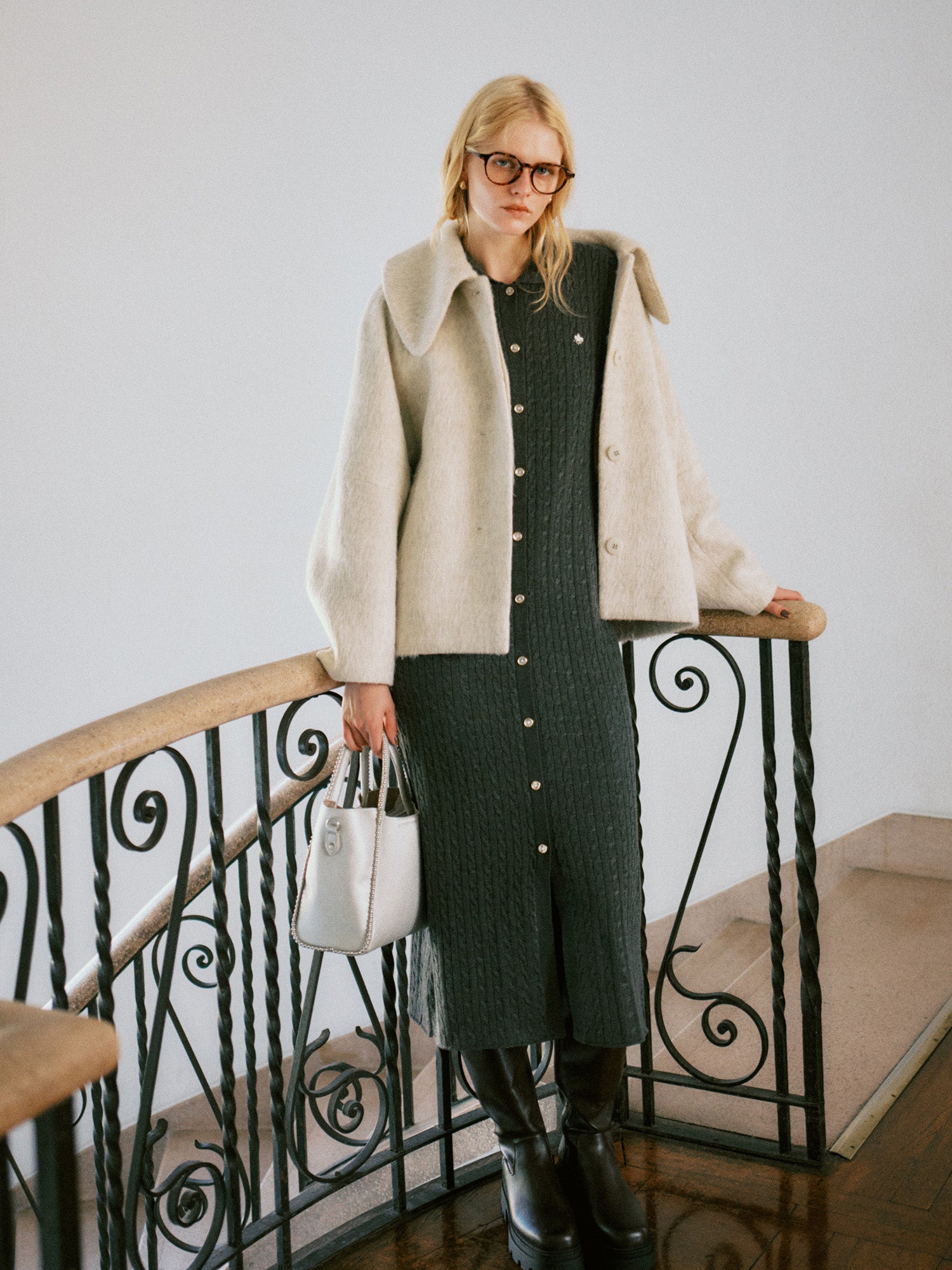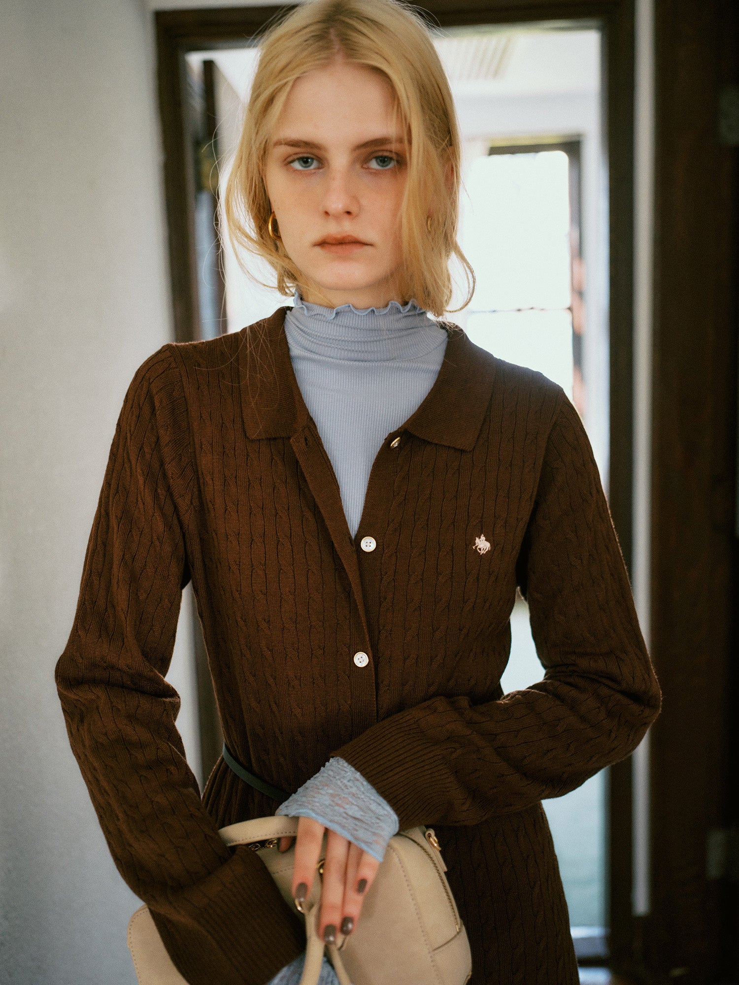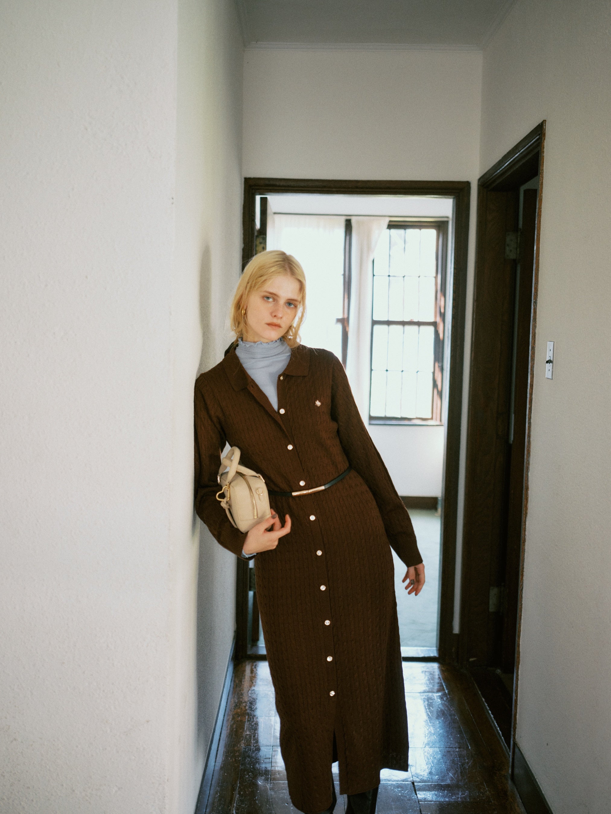 Iラインシルエットで上品さと女性らしさを兼ね備えたポロ襟のケーブルニットワンピース。