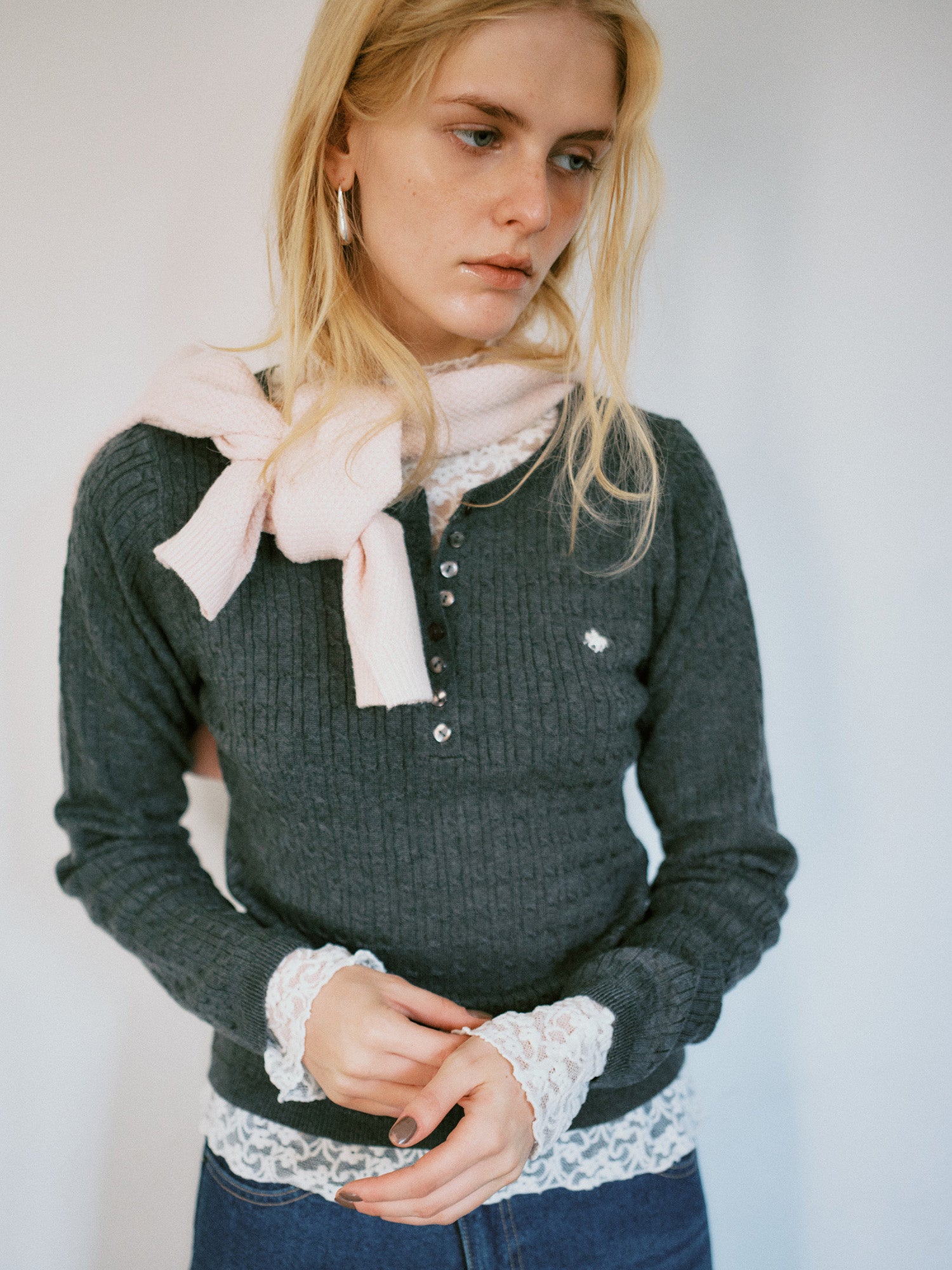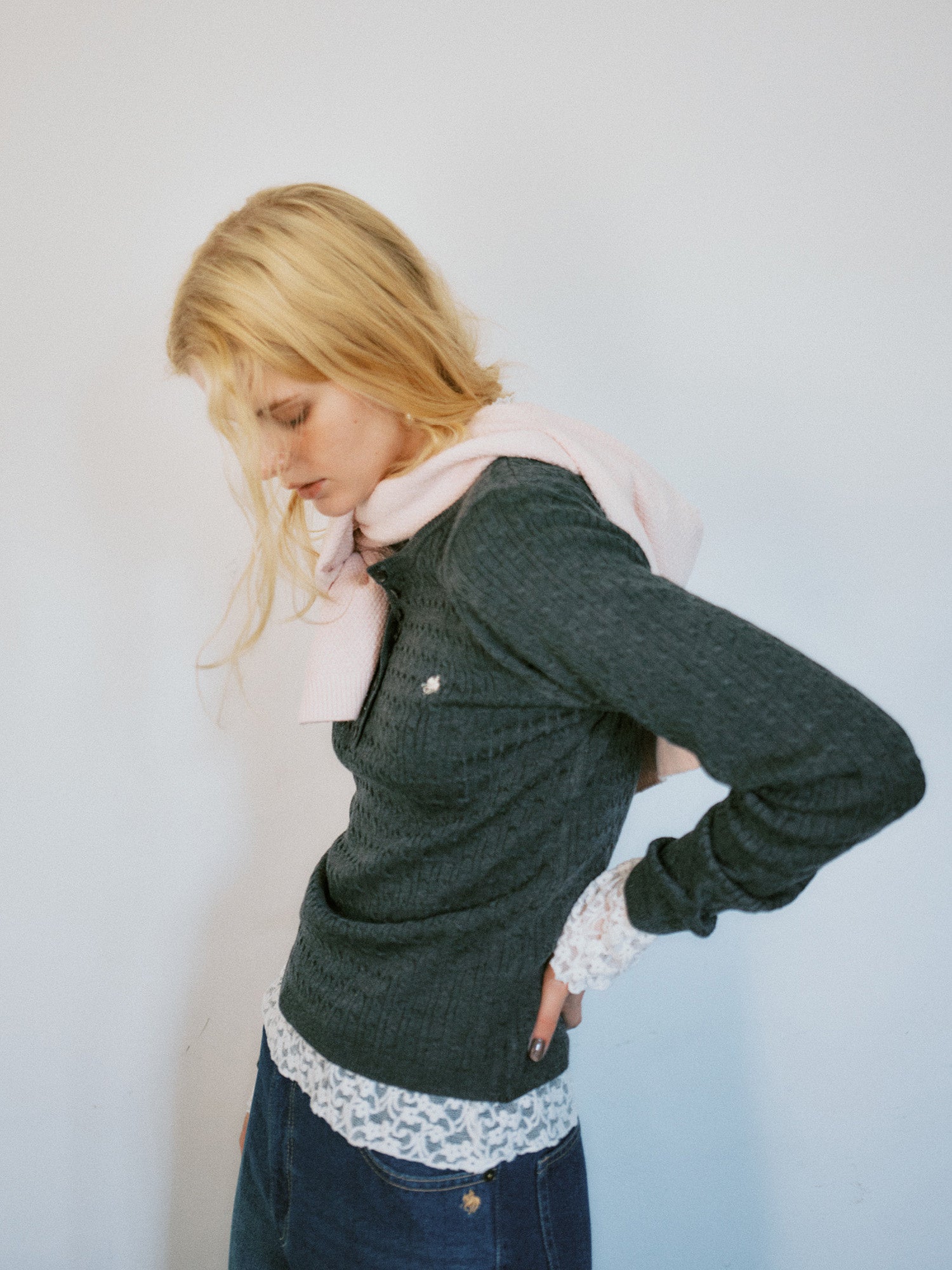 デコルテを美しく見せるヘンリーネックデザインと、胸元&背中に施したPOLO BCSのロゴ刺繍がポイント。キラッと光る縁ありボタンが、コーディネートのアクセントに。