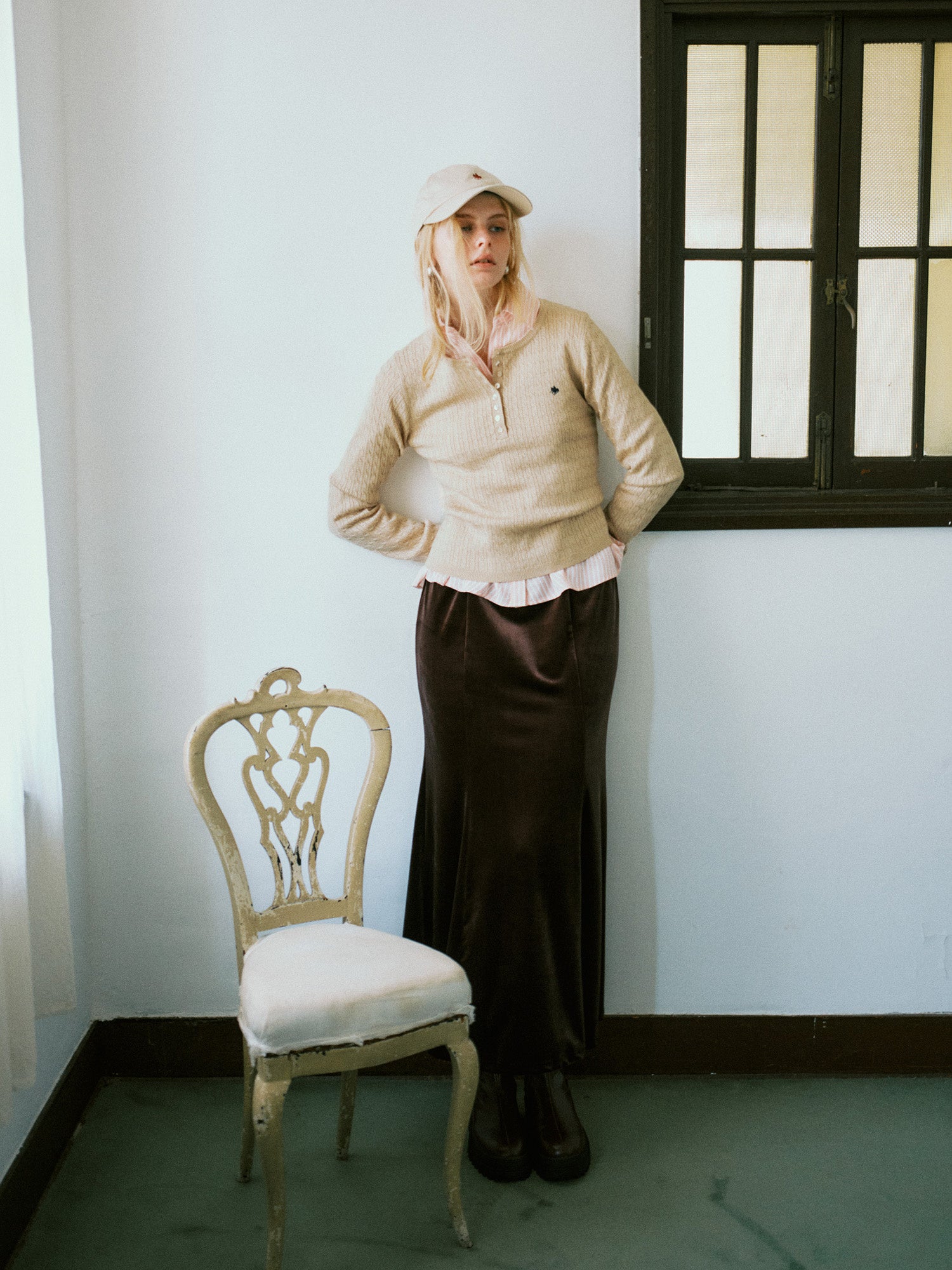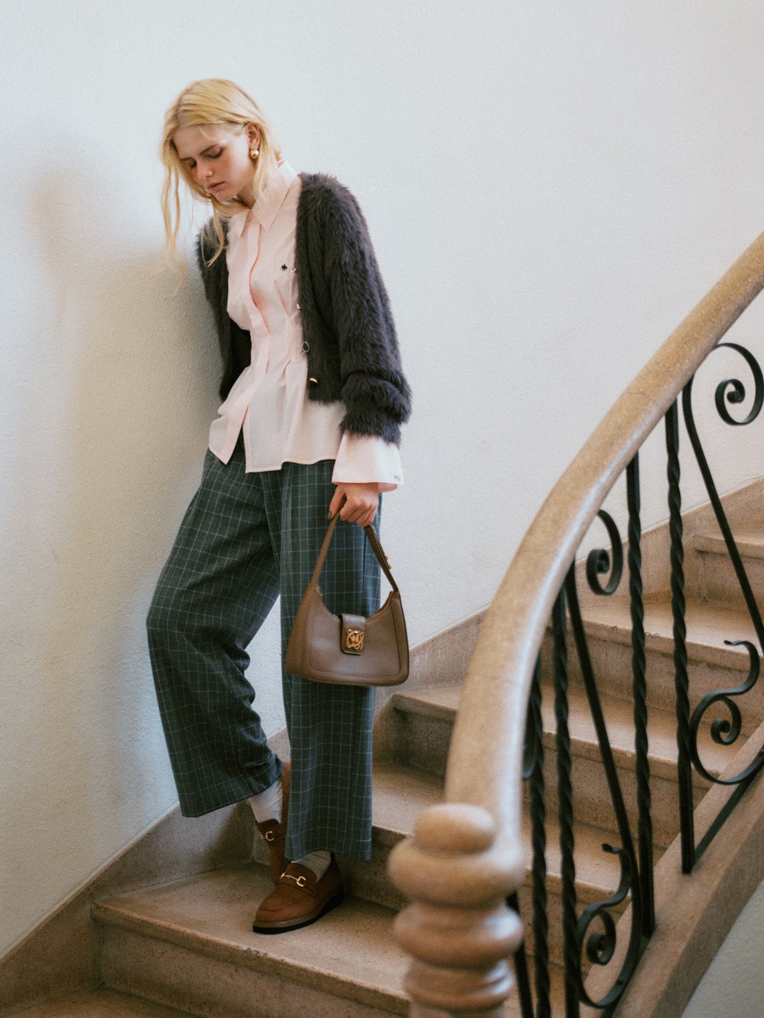 撮影では、温かみのある空間を舞台に、凛とした知性と柔らかな女性らしさが共存するトラッドムードを表現。軽やかなニットトップスやアーガイルカーディガン、着映えするペプラムシャツ、すっきりした印象のニットワンピースなど、クラシカルな要素を今の気分で着こなせるラインアップが揃いました。さらに、コーディネートのアクセントとなる「ツイルロゴキャップ」などの小物も加わり、秋冬のスタイルをより華やかに仕上げます。