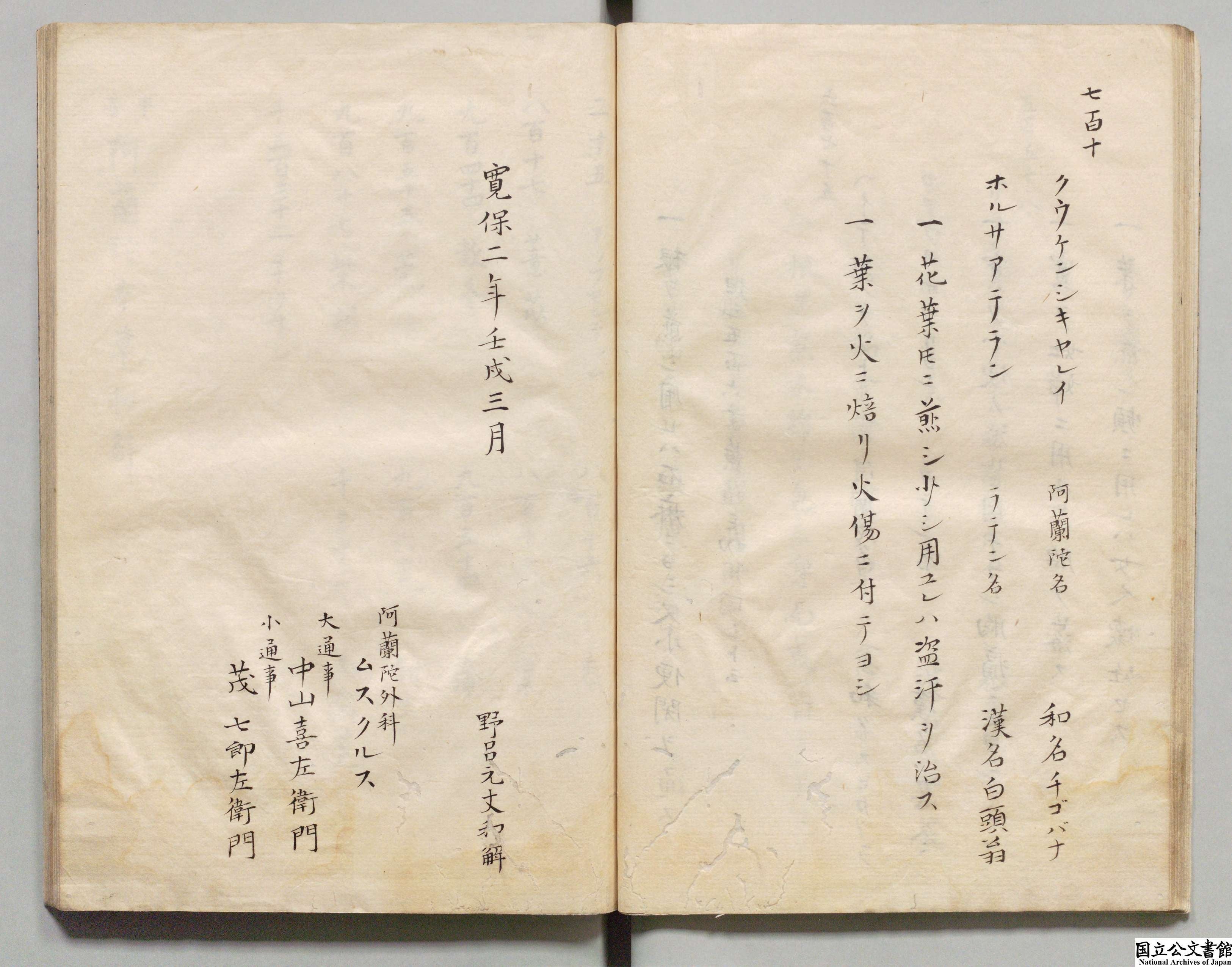 『阿蘭陀本草和解』(おらんだほんぞうわげ)は、吉宗の命令を受け、幕府の医官で本草学者でもあった野呂元丈(1693-1761)が紅葉山文庫所蔵のヨンストンの動物書『動物図説』と、ドドネウスの植物書『草木誌』を抄訳したものです。薬草のオランダ名、ラテン名、和名や効能などが記されています。平成11年(1999)に国の重要文化財に指定されました。