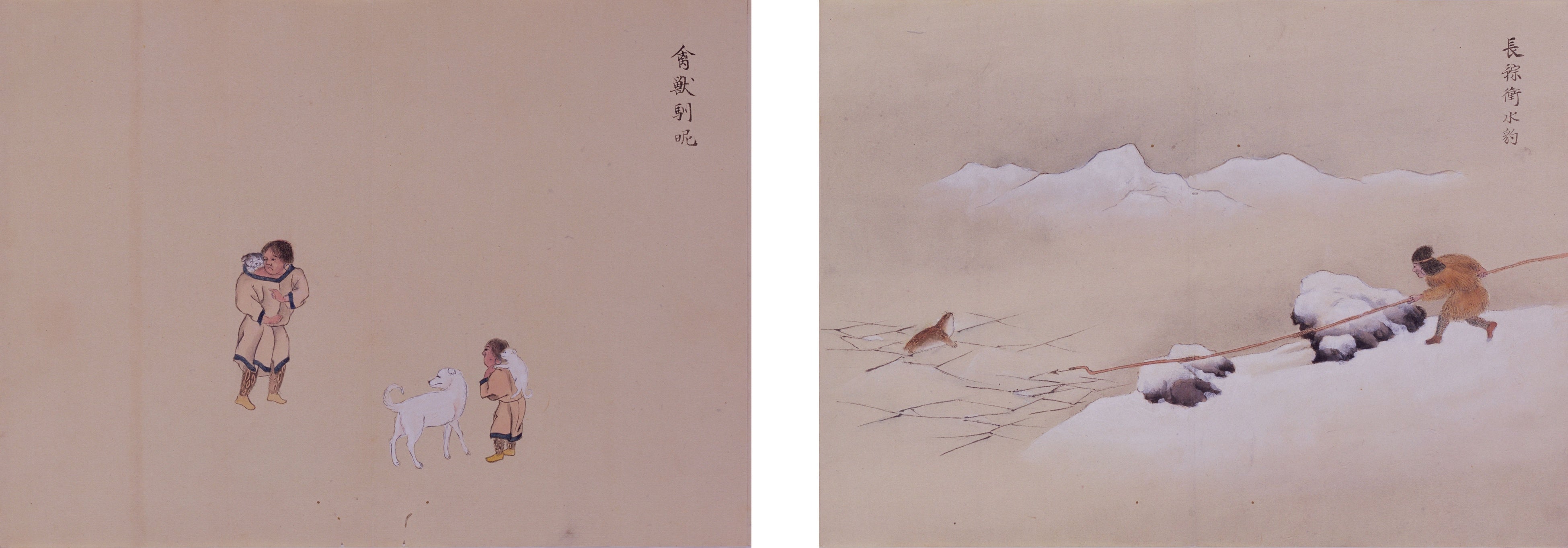 『北夷分界余話』(ほくいぶんかいよわ)は、間宮林蔵(1775-1844)のカラフト調査について、林蔵が口述したものを松前奉行所同心・村上貞助(1780-1846)が、編集・筆録したものです。彩色図96図を用いてカラフトアイヌの人々の生活が忠実に描かれている、カラフトの地誌・民俗誌です。『東韃地方紀行』(とうだつちほうきこう)、『北蝦夷島地図』(きたえぞとうちず)とともに「間宮林蔵北蝦夷等見分関係記録」として平成3年(1991)に国の重要文化財に指定されました。