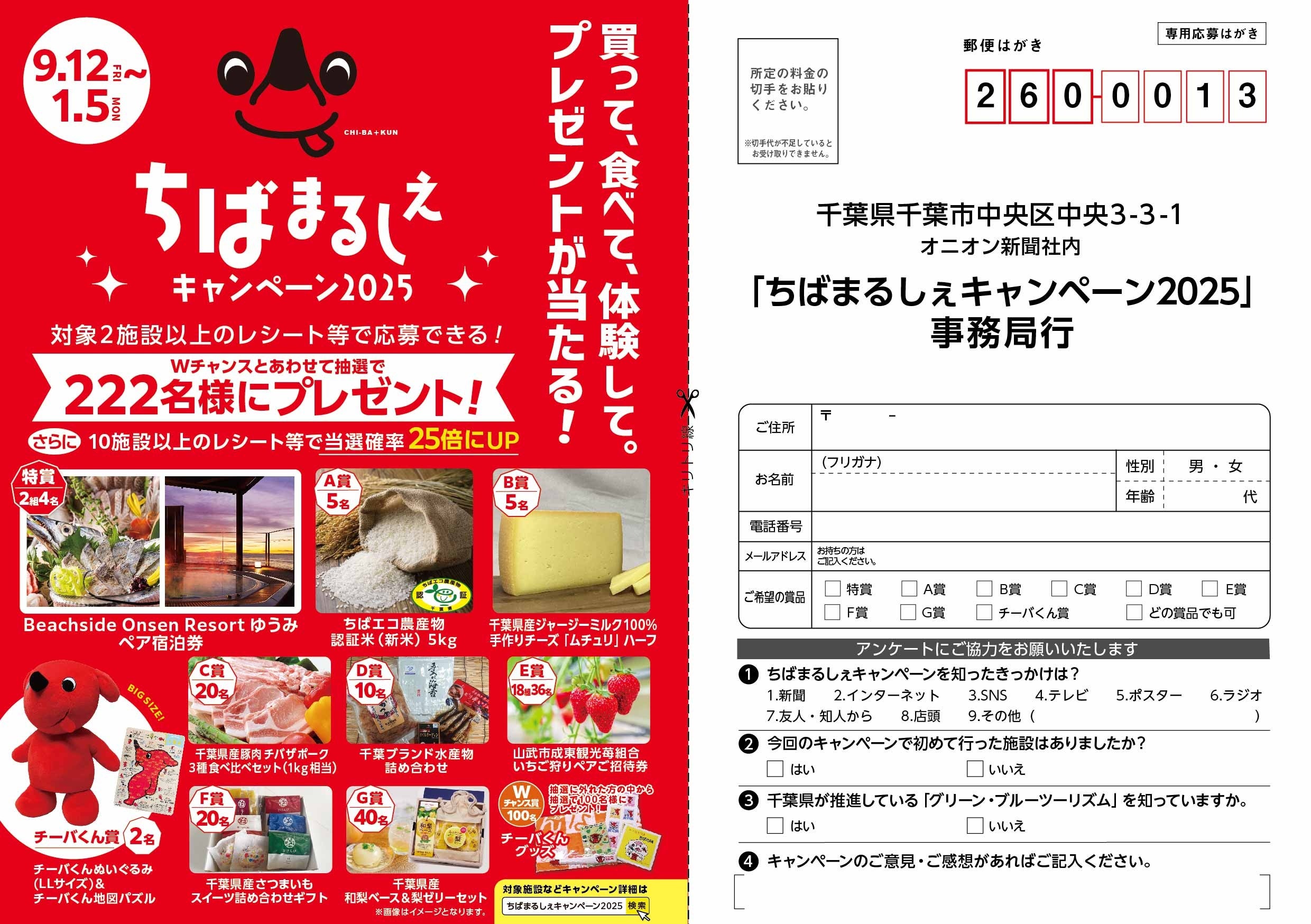 千葉県農林水産部農地・農村振興課(所在地:千葉市中央区市場町1-1/事務局:株式会社オニオン新聞社、本社:千葉県千葉市中央区、代表取締役:山本 寛)では、秋から冬にかけて多く出回る旬の県産農林水産物を多くのお客様に味わっていただけるよう、道の駅や直売所など複数の対象施設を利用した方に豪華なプレゼントが当たる「ちばまるしぇキャンペーン2025」を2025年9月12日より開催しています。
