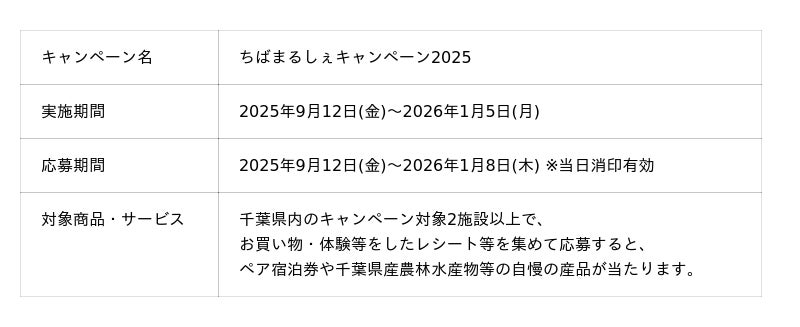 買って、食べて、体験して。ペア宿泊券や千葉県の自慢の産品など豪華プレゼントが当たる「ちばまるしぇキャンペーン2025」来年1月5日(月)まで開催中!
