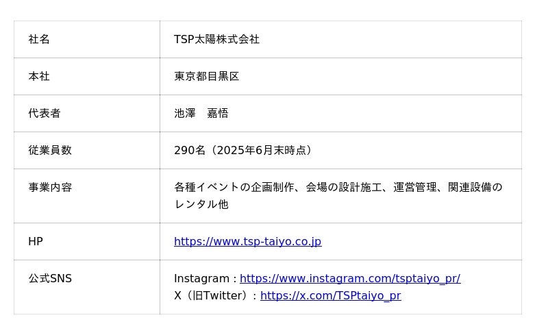 2025年で設立70周年を迎えたTSP太陽株式会社は、空間ソリューションによるイベントコンサルティングから企画・制作まで、あらゆる感動の場を一気通貫した支援で創造するプロフェッショナル集団です。国際的なビッグイベントを始め、あらゆるイベントに携わるデザイン・コンサルティング会社として、収益の最大化を図る事前収支計画から企画・クリエイティブ制作・建築設計・施工・運営までをトータルソリューションとして提供しています。PR・プロモーション・イベントに付随するホスピタリティサービスもお任せください。近年では、豊富な経験から培われた独自のノウハウを駆使し、ダイバーシティやSDGs・ESGへの取り組みを積極的に推進しています。
