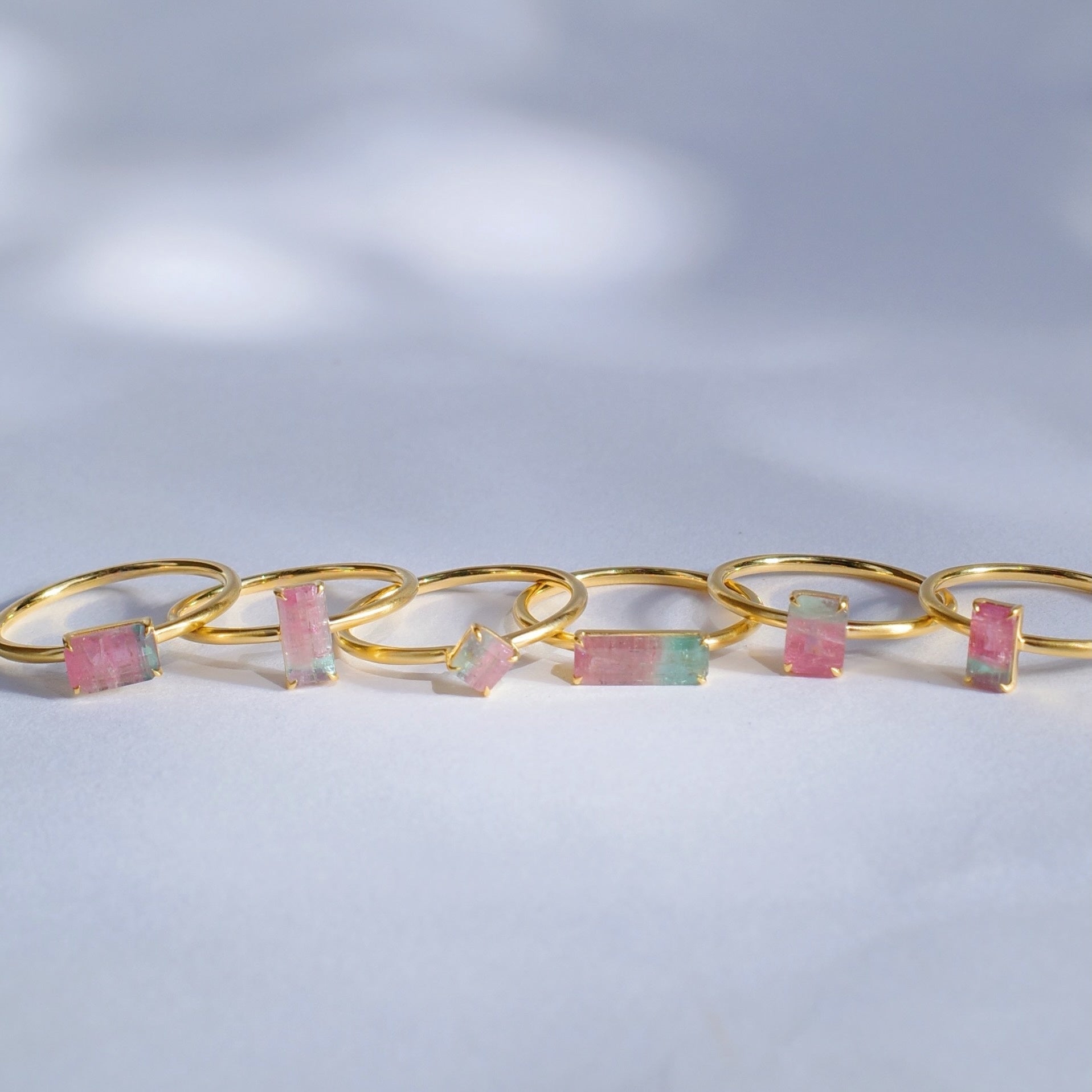 淡いピンクとグリーンが織り成す幻想的なバイカラートルマリン。モダンなレクタングルカットの石の美しさを存分にお楽しみいただけるよう、シンプルにあしらいました。唯一無二の1点もののリングです。