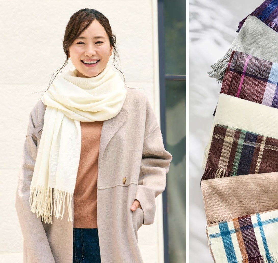 ラフに巻いてもキマる、便利であたたかい大判ストールです。環境にやさしいリサイクル糸を使用しています。今年は白などの無地を品揃えし、無地3色・チェック4色のカラーを展開していま
