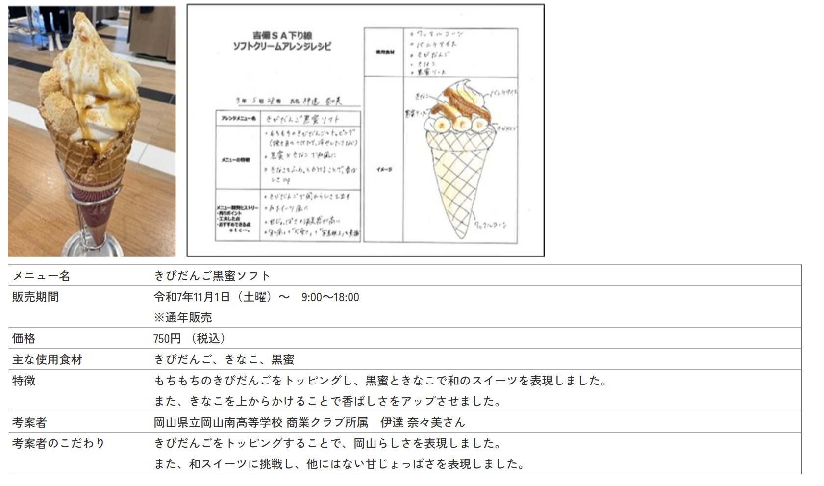 令和7年11月1日(土曜)からE2 山陽自動車道 吉備SA(下り線)において、岡山南高等学校の生徒が考案した、岡山県産の食材・特産品を使用した「晴れの国ソフト」・「きびだんご黒蜜ソフト」(考案ソフト)を販売します。