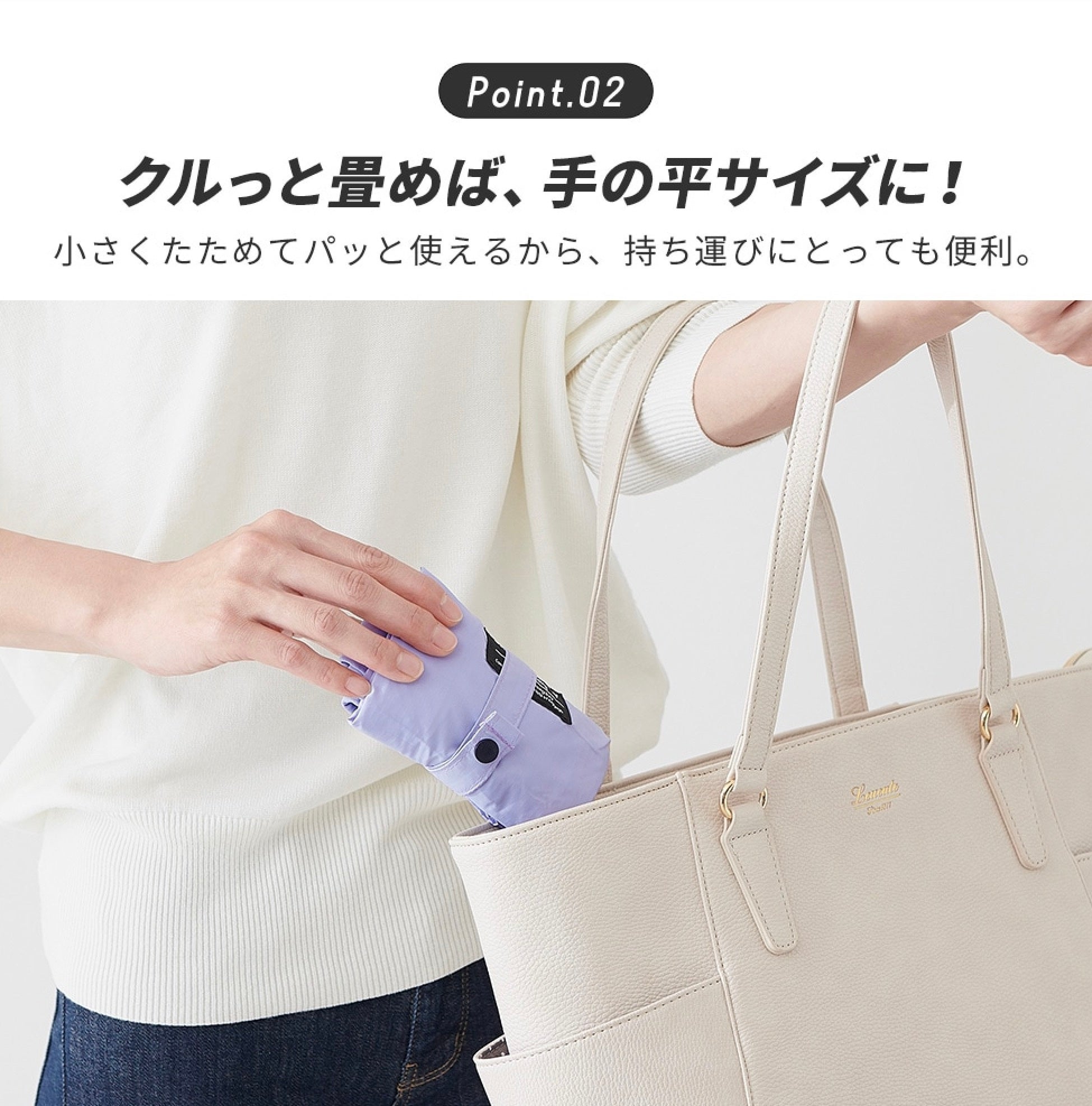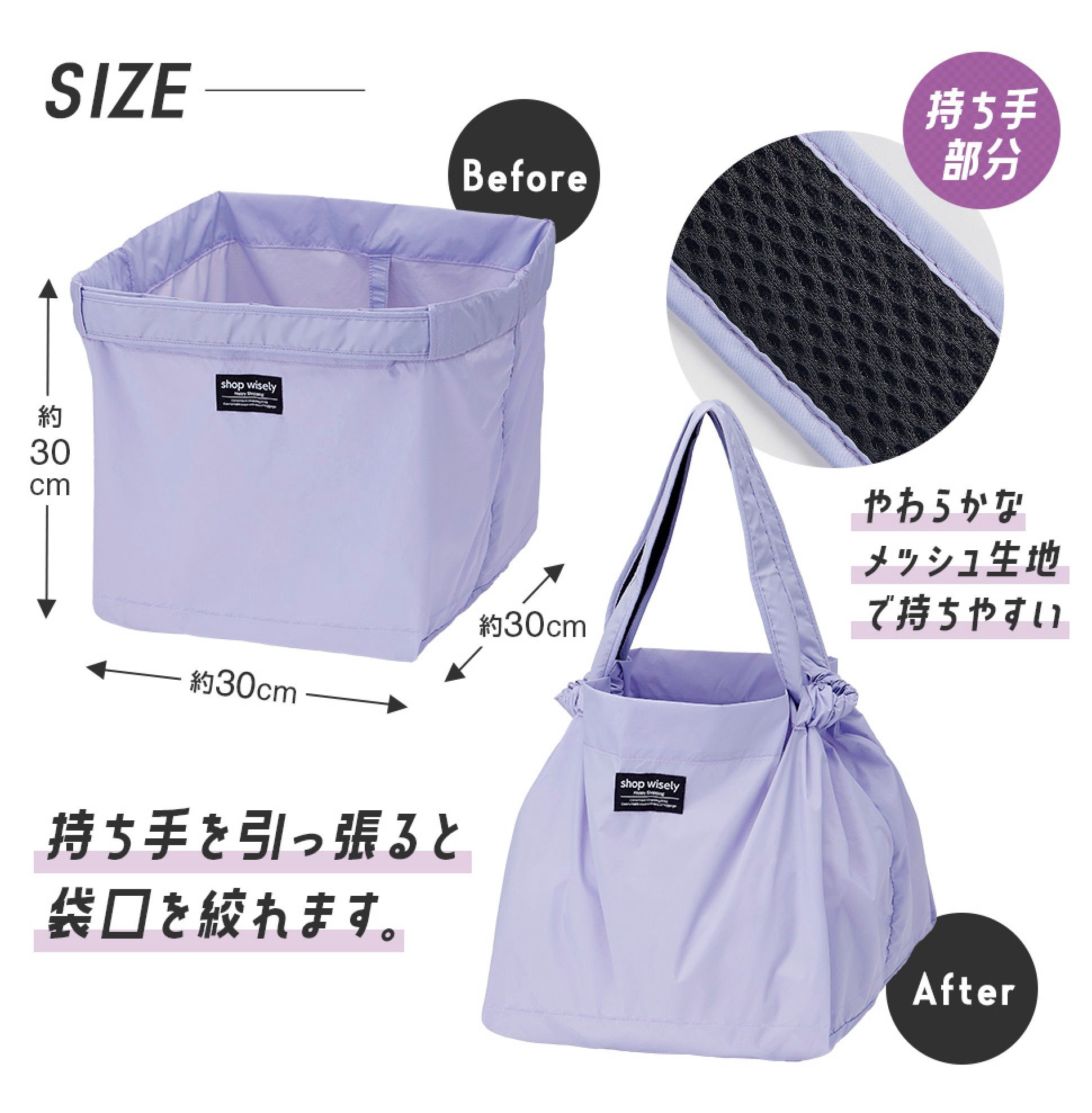 持ち手部分はやわらかメッシュ生地で持ちやすく、使わないときは手の平サイズにたためます。
