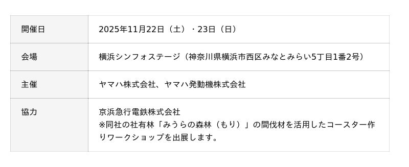 ヤマハ株式会社(以下、当社)は、ヤマハ発動機株式会社と協働し、2025年11月22日(土)・23日(日)の2日間、横浜シンフォステージ(神奈川県横浜市)にて、森林保全をテーマにした親子で楽しめる体験型イベント『PLAY FOREST~乗って、奏でて、森とあそぼう~』を開催します。