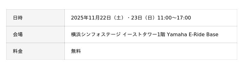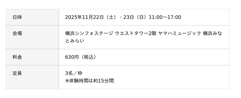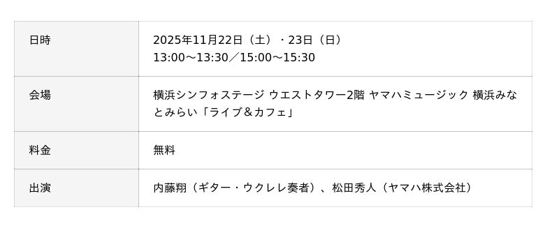 イベントウェブサイト https://retailing.jp.yamaha.com/shop/yokohama-minatomirai/event/detail?id=7659
