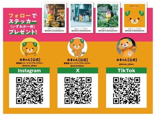 イベント会場にてみきゃん【公式】Instagram/X/TikTokのフォロー画面をご提示いただいた方に、 先着で「kawaiiみきゃんオリジナルステッカー」を1枚プレゼントします。