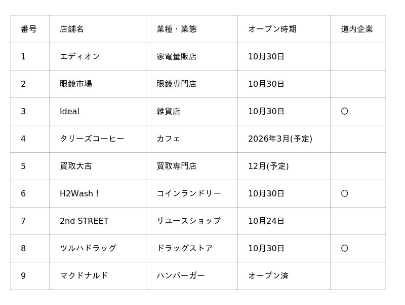家電量販店「エディオン」や眼鏡専門店「眼鏡市場」、ドラッグストア「ツルハドラッグ」など、7テナントがオープンします。また、リユースショップ「セカンドストリート」は10月24日より中古品の買取サービスを先行して開始します。なお「マクドナルド」は2024年9月20日より開業しています。