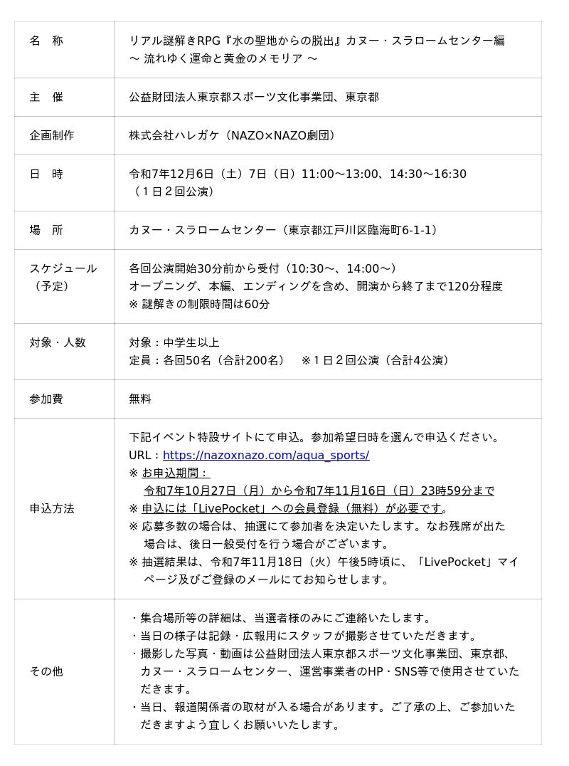 リアル謎解きRPG第1弾は、国内初の人工カヌースラロームコースとして整備した「カヌー・スラロームセンター」(江戸川区)で、令和7年12月6日(土曜日)、7日(日曜日)の2日間開催します(各日2公演の全4公演/参加費無料)。