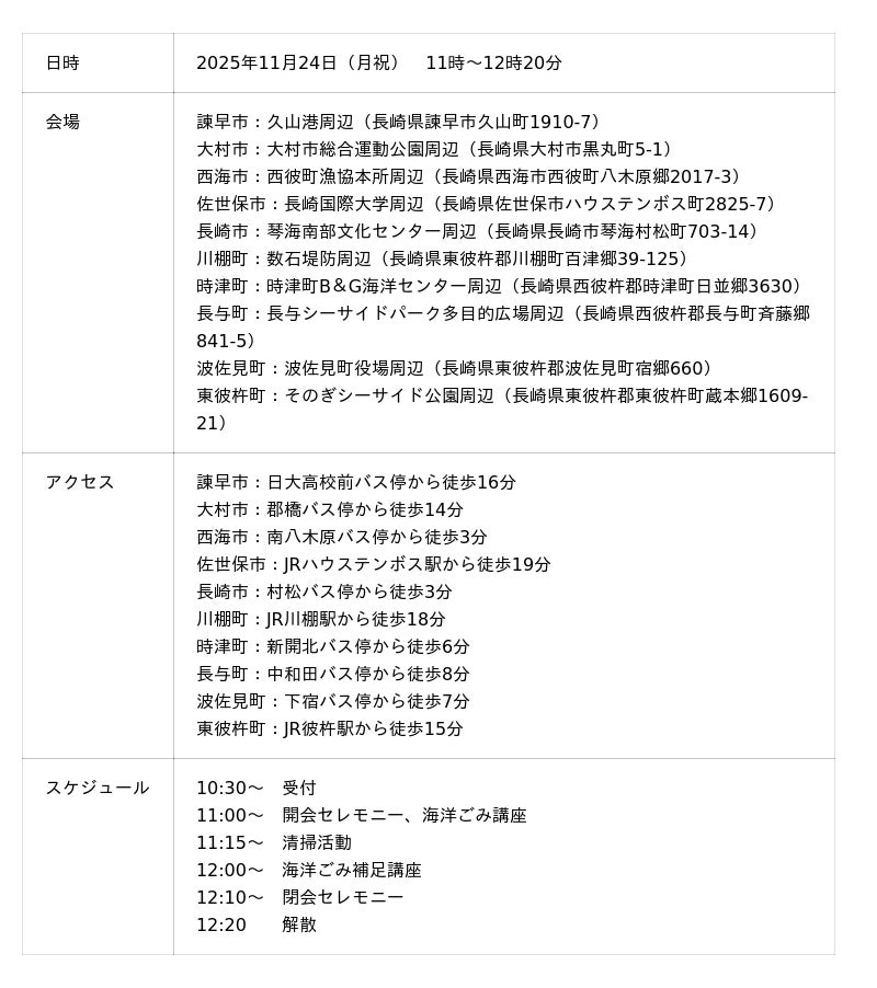 一般社団法人大村湾ワンダーベイは、大村湾流域の5市5町の自治体・企業・地域住民のひとりひとりが「大村湾を守る気持ち」を持ち、アクションを起こすことを目的に、2025年11月24日(月祝)に「Wonder bay challenge2025in大村湾」を開催いたします。大村湾ワンダーベイプロジェクトは、地元大村湾を身近に感じ、海の環境について考えるきっかけを創出していきます。