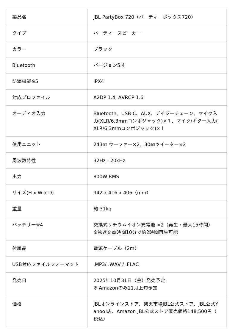 ハーマンインターナショナル株式会社(本社:東京都千代田区、代表取締役:桑原拓磨)は、アメリカ カリフォルニア発祥の世界最大級のオーディオブランドであり、日本においてワイヤレススピーカー7年連続販売台数No.1※1に輝く「JBL」より、大迫力のJBLプロ・サウンドを楽しめるパーティースピーカー「JBL PartyBox 720(パーティーボックス 720)」を2025年10月31日(金)よりJBLオンラインストア、楽天市場JBL公式ストア、JBL公式Yahoo!店およびAmazon JBL公式ストアにて限定発売いたします。