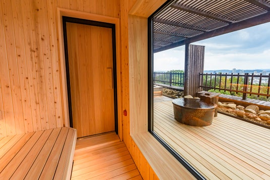 ・絶景を望むサウナルーム(シティビュー/ヒルサイドビュー)・ヒノキを使用したセルフロウリュ サウナ