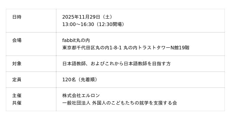 日本人と外国人向けに「グローバルチームビルディング」や「やさしい日本語」をテーマとした各種日本語研修を提供する株式会社エルロン(本社:東京都千代田区、代表取締役:石川陽子、以下「エルロン」)は、2025年11月29日(土)に「第5回日本語教師オールスター収穫祭」を東京・丸の内にて開催いたします。