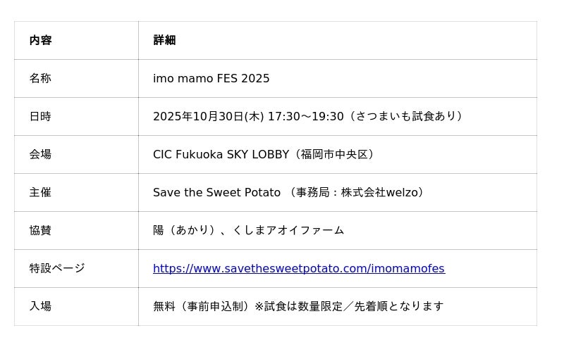 農園芸のイノベーションカンパニーwelzo(本社:福岡市博多区、代表取締役社長:金尾佳文)が主導する産学連携コンソーシアム「みんなのサツマイモを守るプロジェクトSave the Sweet Potato(SSP)」は、10月30日(木)に「imo mamo FES 2025 スイーツ編」をVenture Cafe Fukuoka(福岡市)にて開催いたします。