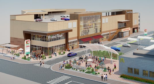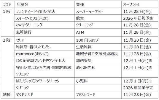 当店は、食品スーパー「フレンドマート守山駅前店」を核とした複合型施設です。3階建ての施設には、100円ショップや雑貨店のほか、内科や小児科などのクリニック、守山市の子育て支援拠点施設「mamocco(まもっこ)」が入店します。また、敷地内には、ファストフードチェーン「マクドナルド」、屋外イベントスペースが誕生します。なお、施設の詳細は改めてお知らせします。