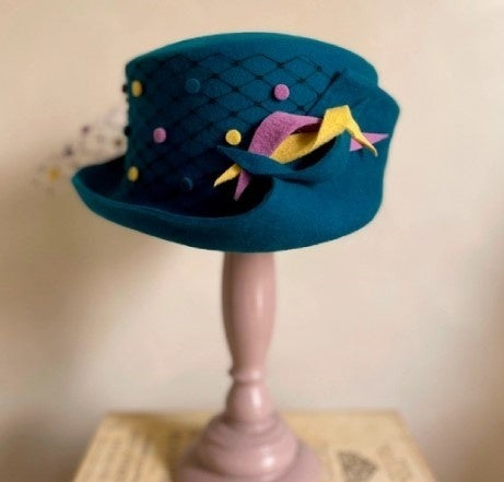 「フレンチマリーゴールド」帽子 38,500円 肌に優しく吸湿性の高い、メリノウール素材のクラシカルなハット。カラフルなチュールとくるくるモチーフでポップに。