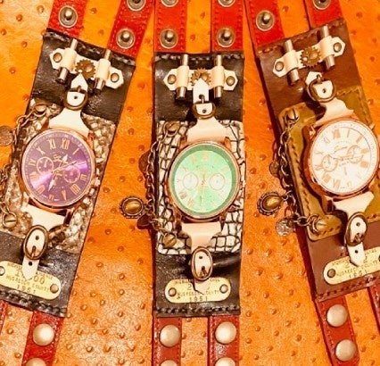 「クォータームーン」時計付きバングル 左から) 蛇革仕様 16,500円、ワニ型押し(牛革) 14,300円、牛革 14,300円 スチームパンクやおいしそうなフードのモチーフなど、豊富なデザインの革雑貨を取り揃え。