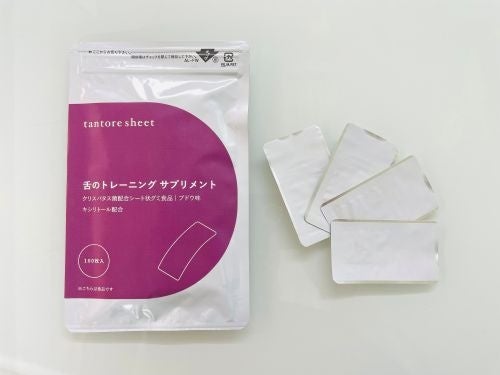 こうしたリスクを防ぐには、舌の筋力トレーニングが鍵。しかし、従来の方法は継続が難しいのが課題でした。そこで開発したのが「tantore sheet(タントレシート)」です。コンセプトは「舌のトレーニングをシート1枚に」。薄いシートを舌で舐めるだけで、いつでも、どこでも、簡単に続けられるよう設計されています。