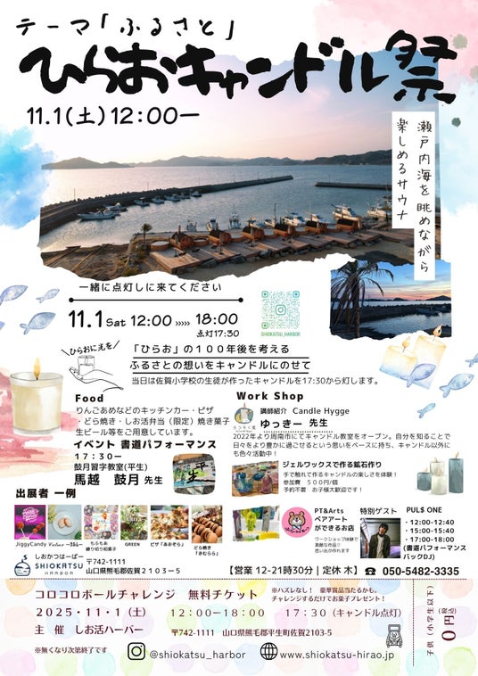 山口県平生町にあるアウトドアサウナ施設「しお活HARBOR」(運営:株式会社FoundingBase(本社:東京都世田谷区、代表取締役:山本賢司、以下「FoundingBase」)は、11月1日に「ひらおキャンドル祭」を開催します。